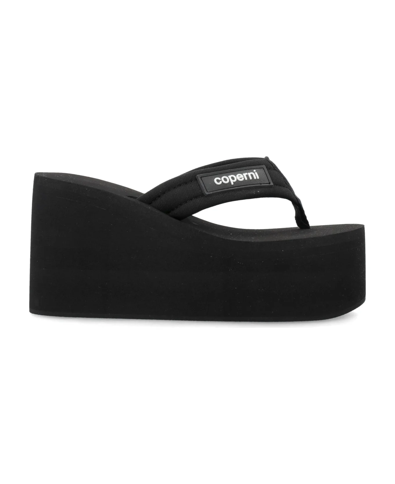 Step Up Your Style With The Coperni Black Wedge Sandals. Featuring Wide Padded Straps For A Secure Fit And A Lightweight Chunky Platform Sole, These Sandals Combine Comfort And Durability. Branded With A Coperni Silicone Patch, They Offer A Sleek, Contemporary Design Perfect For Casual And Dressy Summer Looks. Wide Padded Straps Lightweight Chunky Wedge Coperni Silicone Patch Branding Durable Foam Construction Heel: 9 Cm Platform: 5 Cm Composition: 100% neoprene Made in: Spain Color: BLACK Size and fit: - Heel: 9 cm Platform: 5 cm Model number: COPSH09F6090BLK