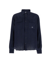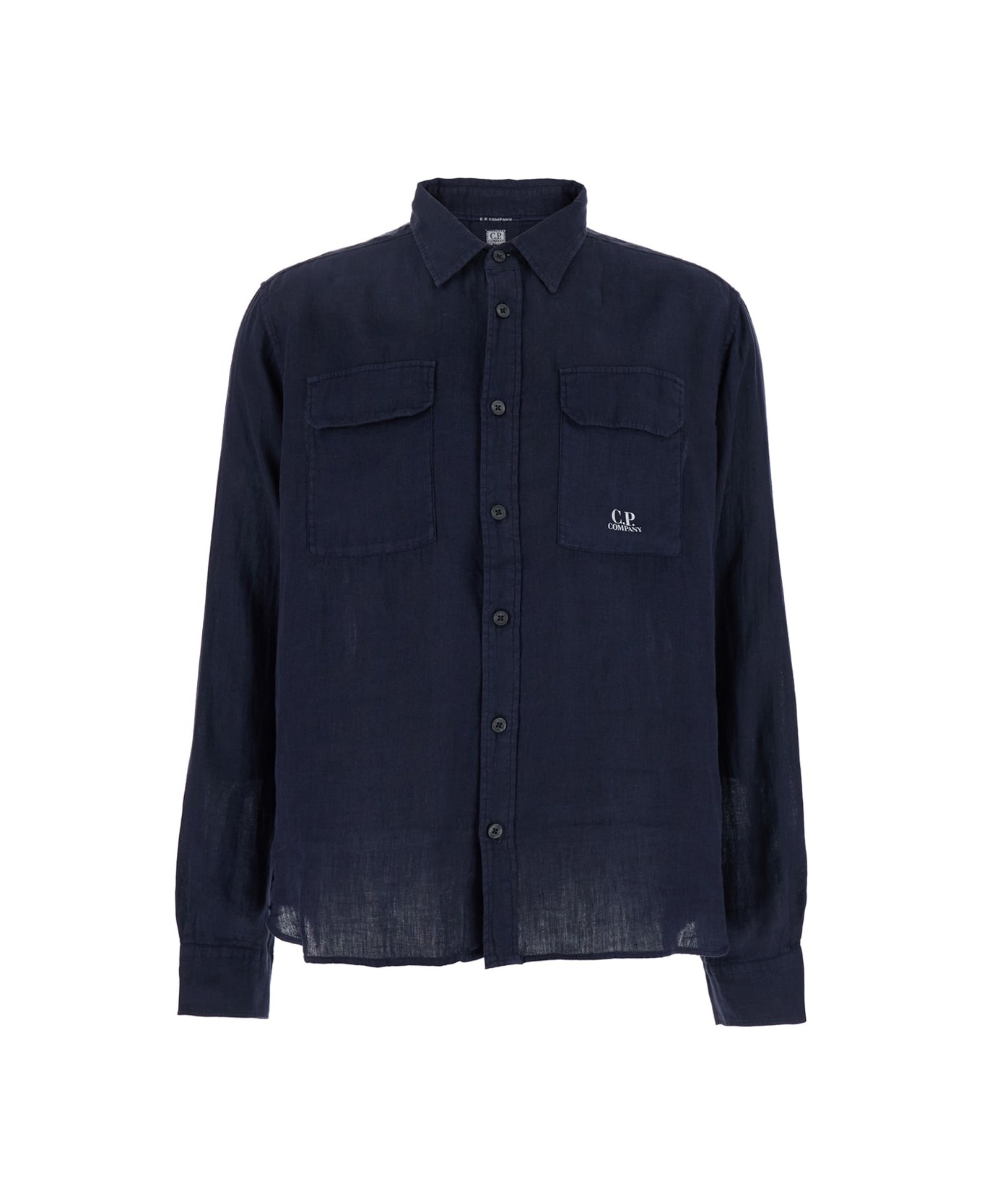 Shirt Blue Classic collar Long sleeves Front button closure Two patch pockets on the chest Lettering logo printed on the front Buttoned cuffs Rounded hem Linen Loose fit Composition: 100% Linen Made in: Tunisia Color: Blu Model number: 18CMSH250A005415G888