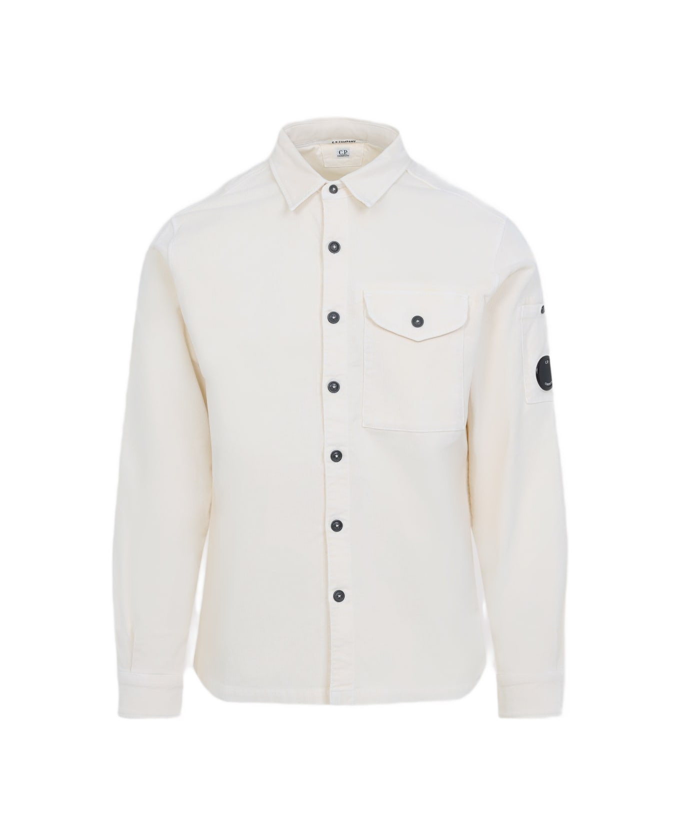 Cp Company LS Corduroy Light Beige Cotton Shirt. Crafted from light beige cotton corduroy, pointed collar, front button fastening, flap pocket on the chest, snap button pocket with Lens detail, long sleeves with buttoned cuffs, back yoke, curved hem. Made in: Italy Color: Pistachio Shell Model number: 19CMSH071A006410O402