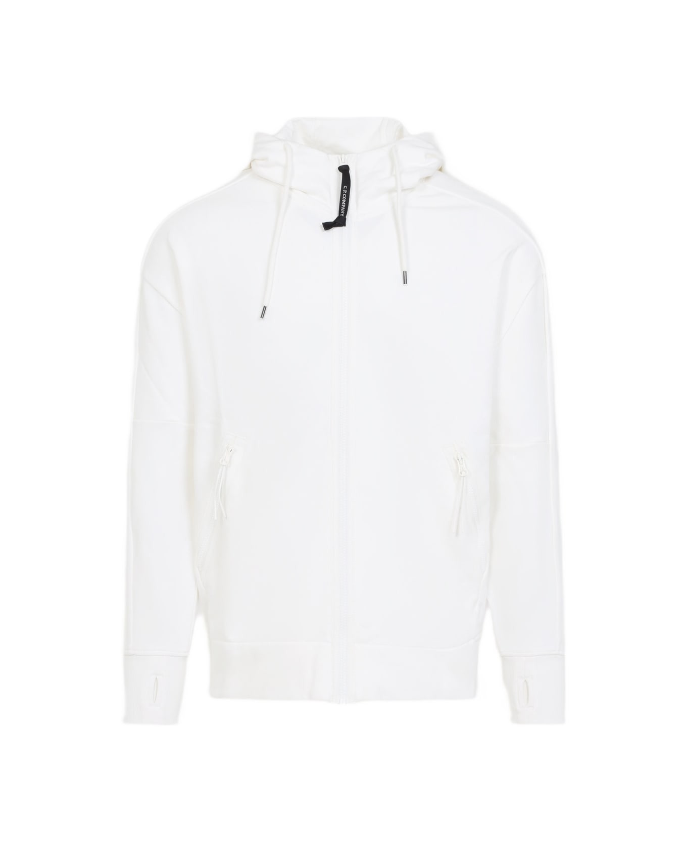 Cp Company Open White Cotton Hoodie. Crafted from white cotton fleece, hood with drawstring and Goggle Lens detail, zip fastening on the front, two zip pockets, dropped shoulders, long sleeves, cuffs with thumbholes, fine ribbed edges. Made in: Myanmar Color: Gauze White Model number: RCCMSS715A005086W103