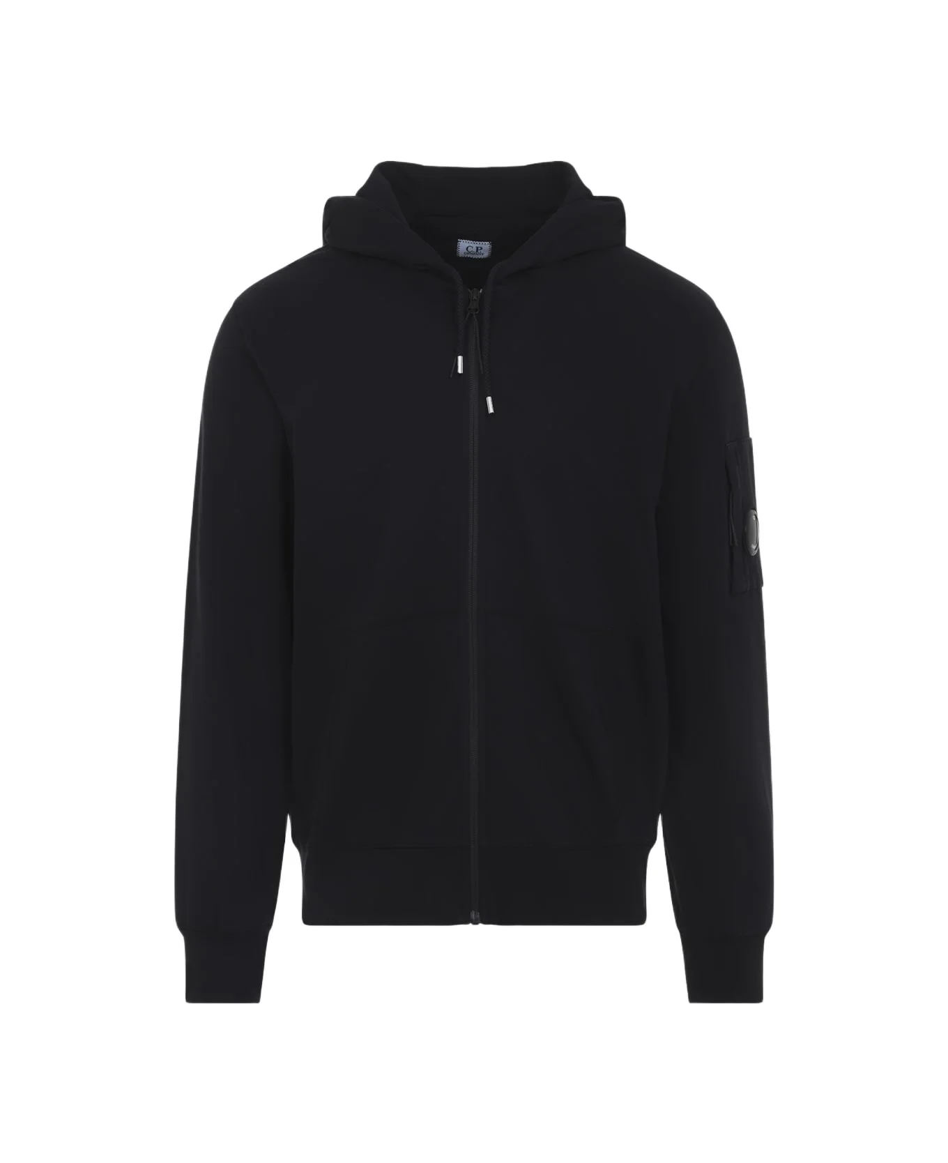C. P. Company Zip Lens Black Cotton Hoodie. Crafted from black cotton, it features a hood with drawstring, front zip fastening, a classic kangaroo pocket, long sleeves, the iconic C. P. lens on the sleeve, ribbed edges, and a straight hem. Made in: Italy Color: Black Model number: 20CMSS081A002246G999