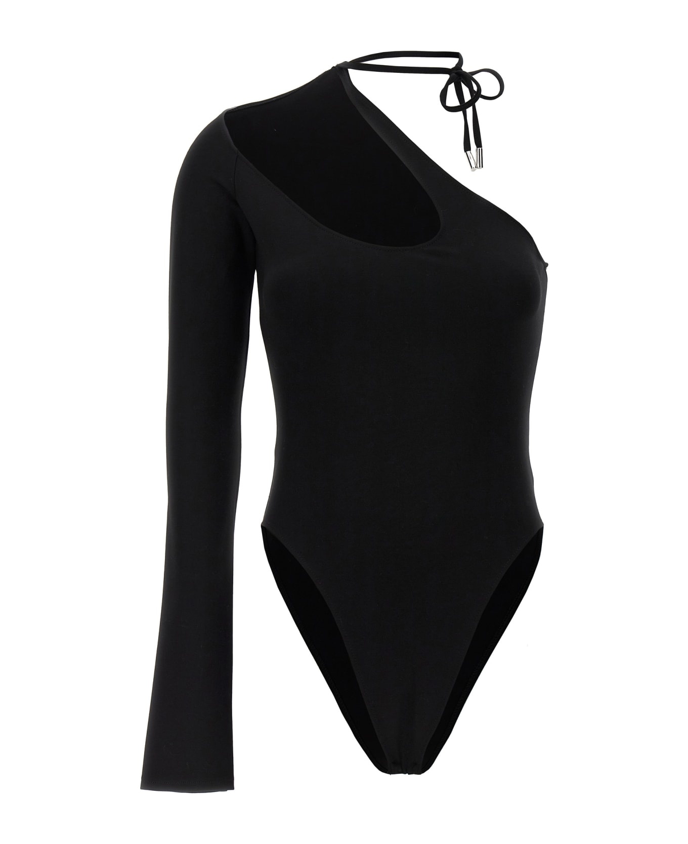 Asymmetrical stretch viscose bodysuit with long sleeves with cut-out detail on the chest and a laced collar. Composition: 60% viscose 35% polyamide 5% elastane Made in: United Kingdom Color: Black Size and fit: - true to size fit UK size Model number: RE24DK83BSBLACK