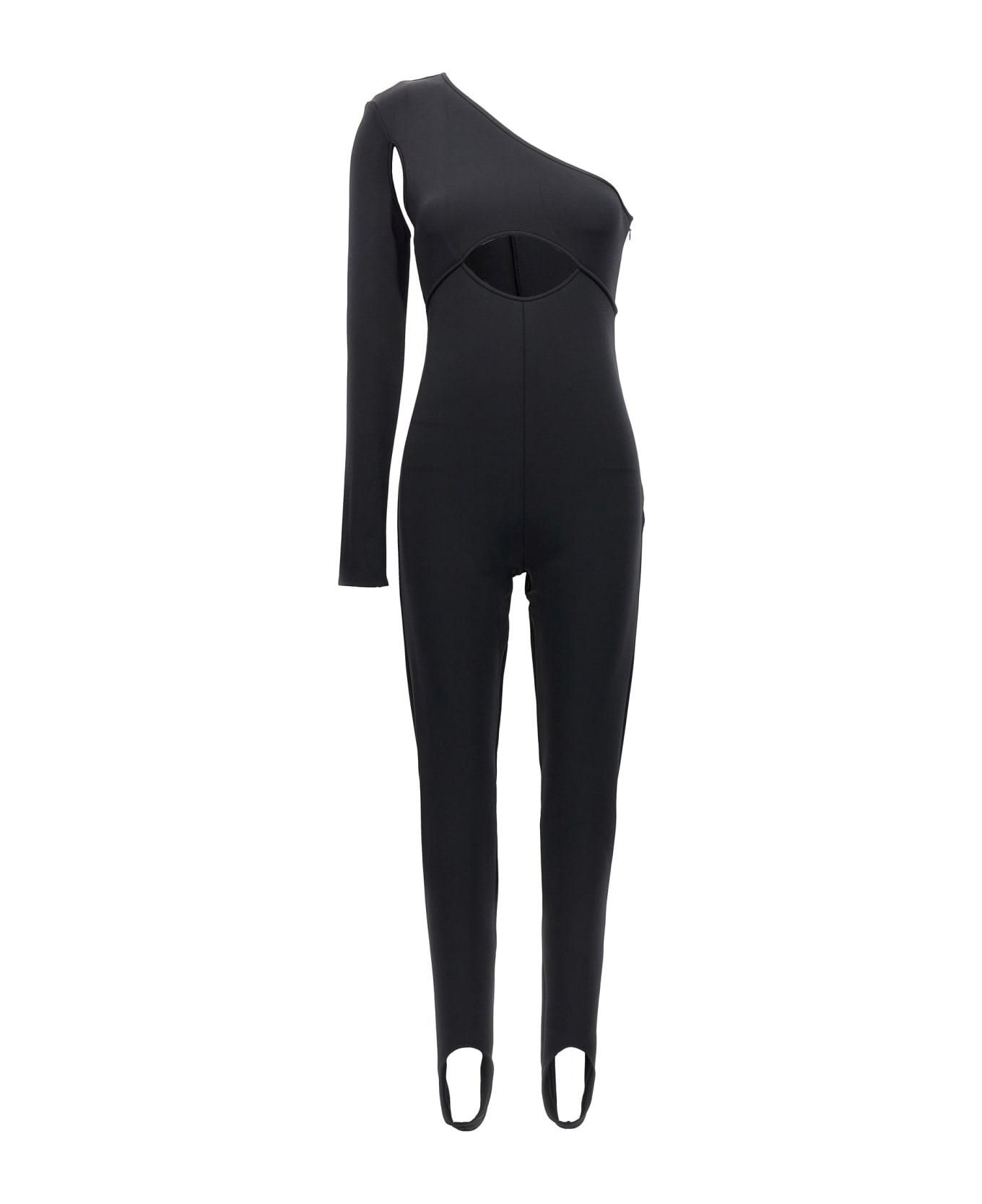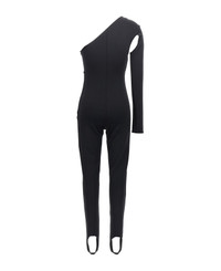 Scuba stretch fabric one-piece bodysuit with front cut out detail, one shoulder with long sleeves, back zip closure, long leg with foot band on the bottom. Composition: 85% polyamide 15% elastane Made in: United Kingdom Color: Black Size and fit: - True to size fit UK size Model number: SS23DK33JSABLACK
