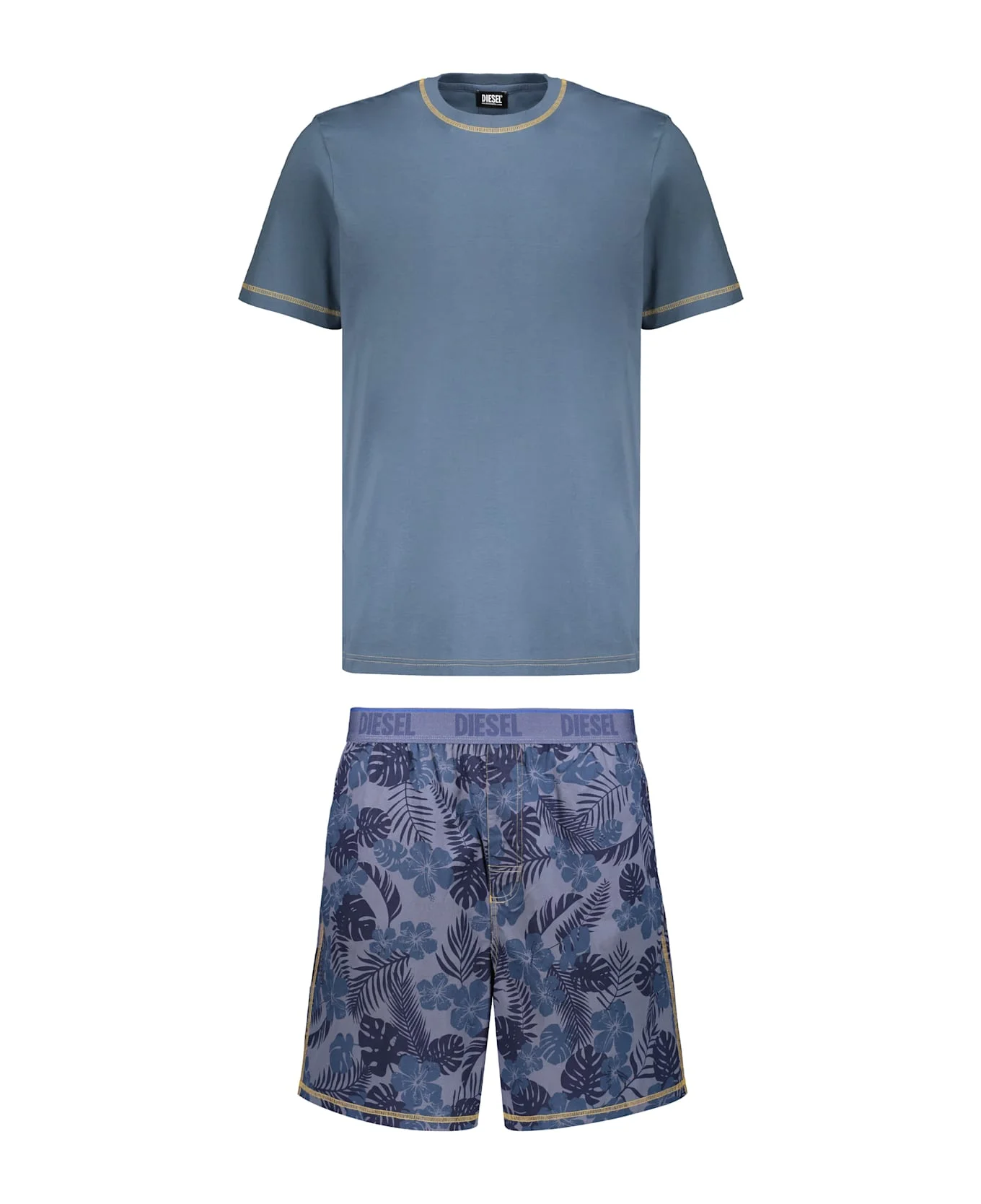 Complete jersey cotton two-piece pajama set with a simple t-shirt. the shorts feature a tone-on-tone tropical print, finished with a contrasting waistband with an all-over diesel logo and a contrasting stripe. both pieces are finished with contrasting stitching. 100% cotton Composition: 100% % Cotton Made in: Italy Color: blue Model number: A051430NCAS8IX