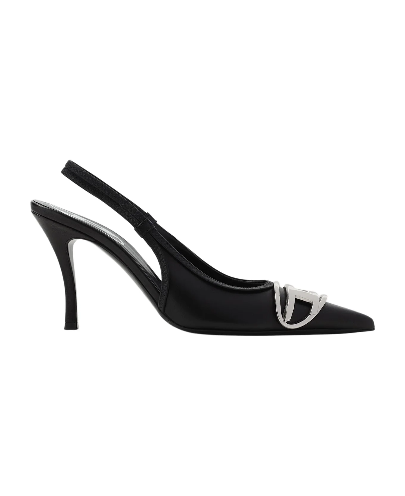 Diesel D-Venus SB Black Leather Decolletes. Crafted from black leather, slingback construction, elongated pointed toe, silver-toned metal logo plaque on the front, covered stiletto heel, leather insole and outsole. Made in: Italy Color: Black Model number: Y02985PR818T8013