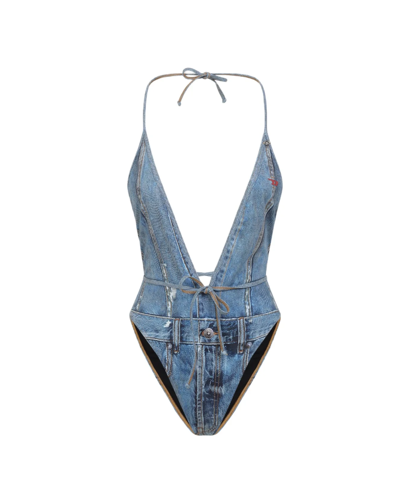 Diesel Kinsley Blue Polyester One-Piece. High-cut one-piece crafted from blue tech fabric with an all-over denim print, featuring a deep V-neckline, a self-tie fastening at the back of the neck, an open back, a self-tie strap that can be crossed around the waist, and a full lining. Made in: Tunisia Color: Denim Model number: A187510BNCWE6866