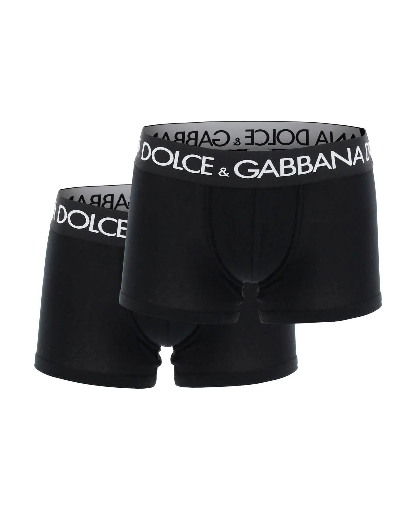 Dolce & Gabbana regular boxer in stretch cotton jersey, characterized by the elastic waistband with contrasting jacquard lettering logo. The pack contains two identical underwear. Composition: 95% cotone, 5% elastane Color: Nero Model number: M9D70JONN97