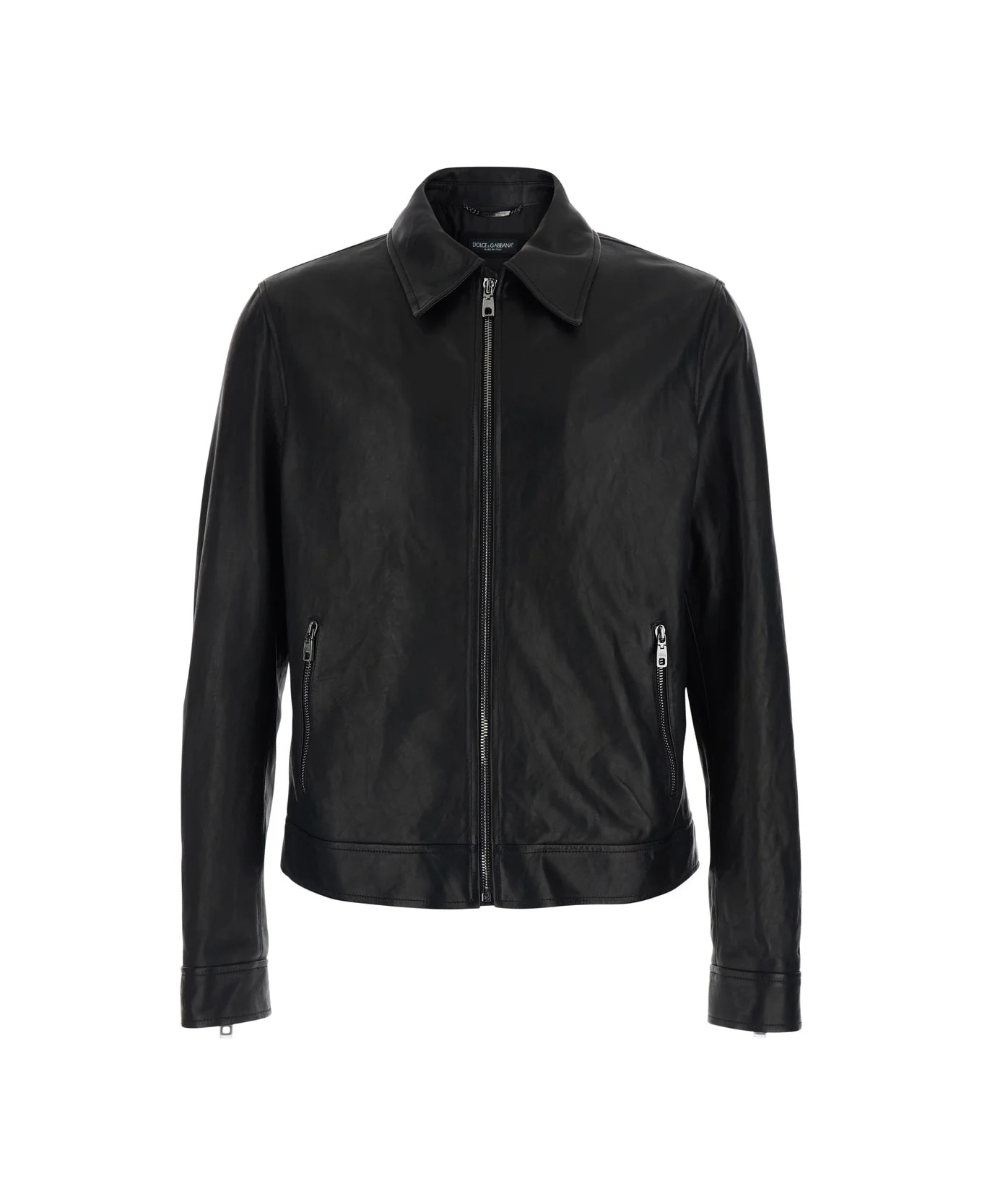 Jacket Black Classic Collar Zip Closure Long sleeves Logo patch on back Leather Regular fit Composition: 100% Viscose Made in: Italy Color: Black Model number: G9CCCLHULZKN0000