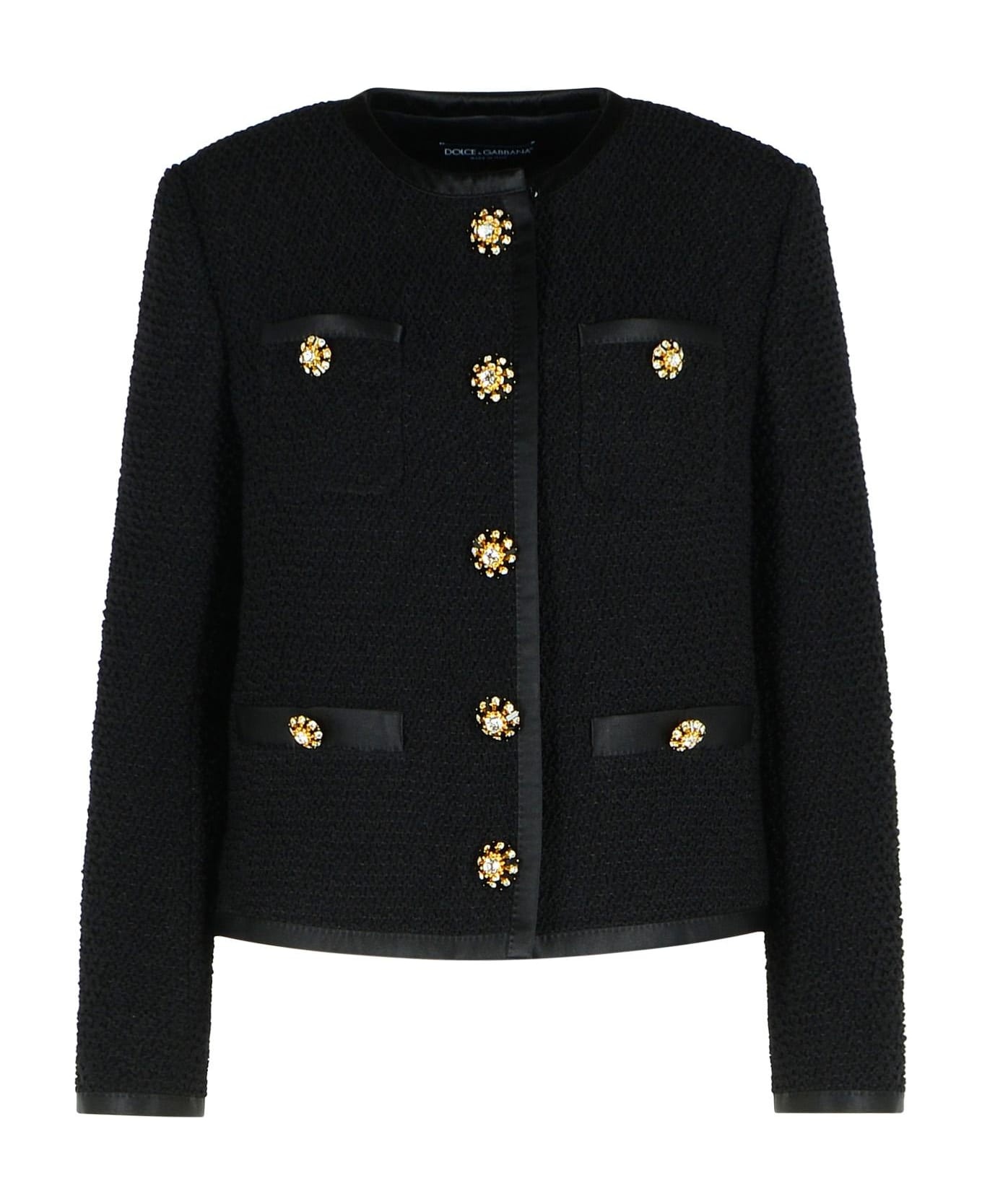 Cropped single-breasted bouclé tweed jacket with bejeweled buttons