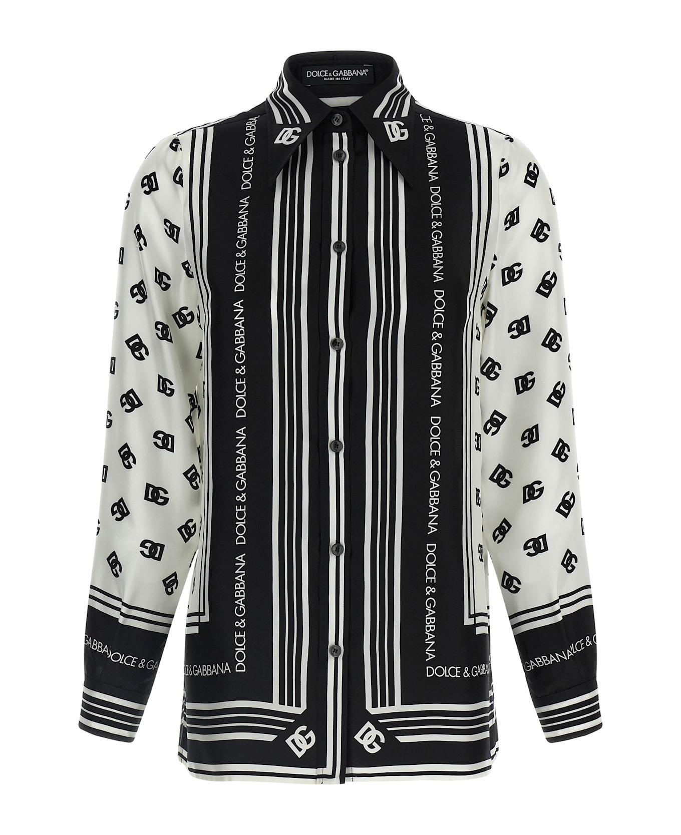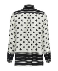 All-over DG print silk twill shirt, pointed collar, front button closure, long cuffed sleeves, side slits. Composition: 100% silk Made in: Italy Color: White/Black Size and fit: - true to size fit Model number: F5S48THI1Z6HA9CN
