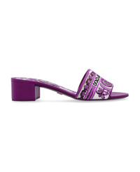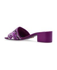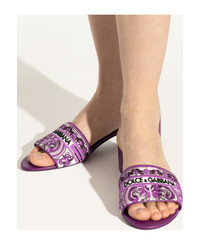 Elevate your ensemble with these exquisite Majolica Pattern Heeled Mules from Dolce & Gabbana. Crafted for the discerning woman, these open-toe mules rest atop a low, broad heel, offering both refined stature and enduring comfort. The front strap is elegantly wrapped in a tapestry of florid-geometry, shimmering with golden accents in a palette of violet, white, and delicate blush, all accentuated by a deep violet trim. The central, boldly emblazoned DOLCE & GABBANA logo distinguishes this piece as a signature of Italian opulence. An exterior in fine textiles, together with a sumptuous leather lining and sole, ensure a sensation of luxury with every step. Redefining contemporary sophistication, these mules embody the unparalleled artistry that has defined Dolce & Gabbana since 1985. Why choose this product? Striking Majolica-inspired ornamental design Distinguished designer branding for an exclusive touch Superior textiles and supple leather for luxury and durability Thoughtfully designed for comfort and versatile elegance Impeccable craftsmanship from a world-renowned Italian house Composition: Inner Layer: 100% Leather Outer Layer: 100% Fabric Sole: 100% Leather Made in: Italy Color: Purple Size and fit: - Heel height: 3cm - Sole Height: 1cm Model number: CR1748AV804I03TN