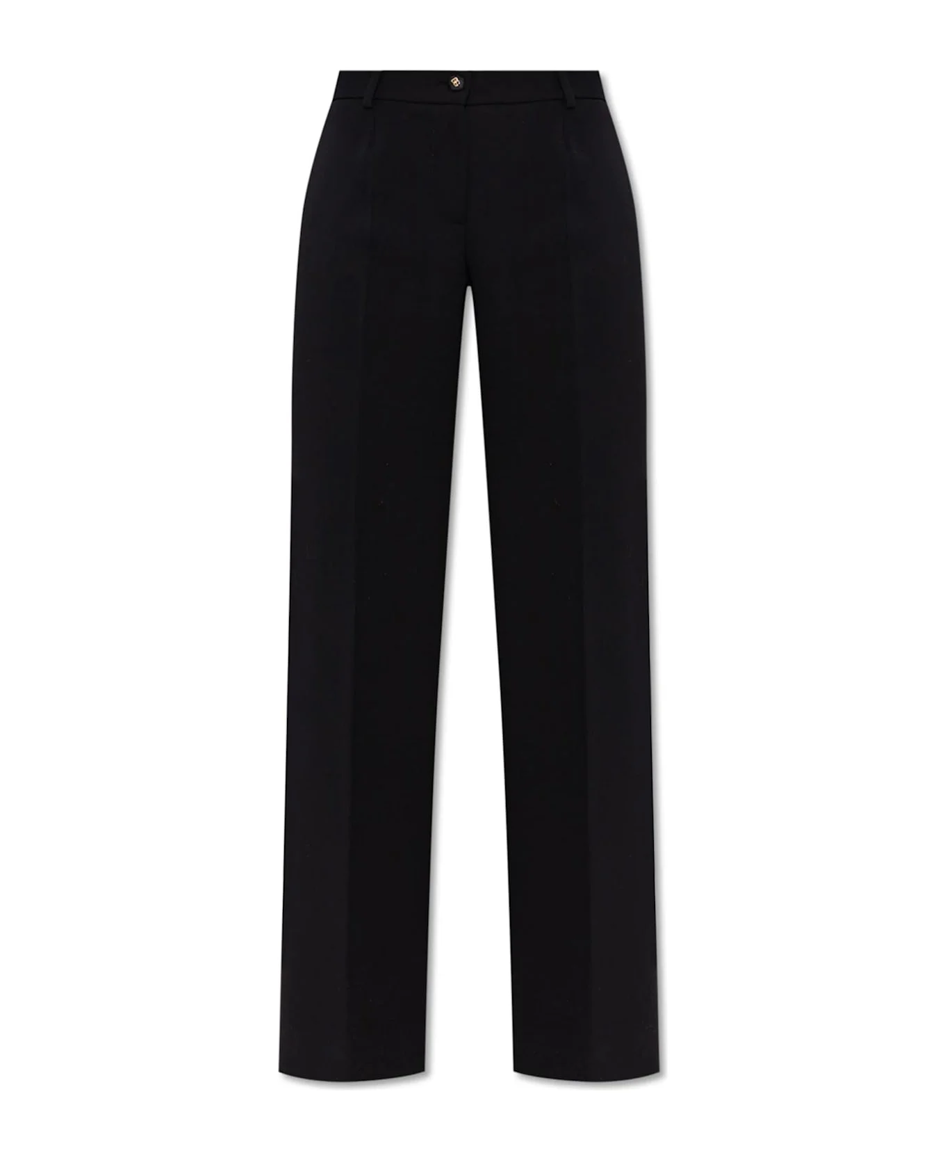 These tailored wool trousers by Dolce & Gabbana effortlessly embody refined sophistication. Rendered in a premium, solid black wool fabric, their sleek, unembellished design exudes timeless elegance. The classic, straight silhouette features a medium-rise waist and a sharply pressed crease along the entire length of the leg, underscoring their formal polish. The trousers are finished with a discreet round button, delicately engraved with the designer's iconic DG logo, signifying their distinguished heritage. The smooth, pocketless front and streamline construction at the back create an ultra-clean aesthetic, while the slightly flared hems ensure graceful movement. This piece reflects the enduring legacy of Italian craftsmanship and modern luxury. Why choose this product? Exceptional Italian tailoring from a world-renowned luxury house Exquisite, pure wool fabric for superior comfort and longevity Subtle designer detailing for a touch of understated opulence Timeless cut suitable for both classic and contemporary ensembles Composition: 100% Wool Color: Nero Model number: FTC31TGDCSX