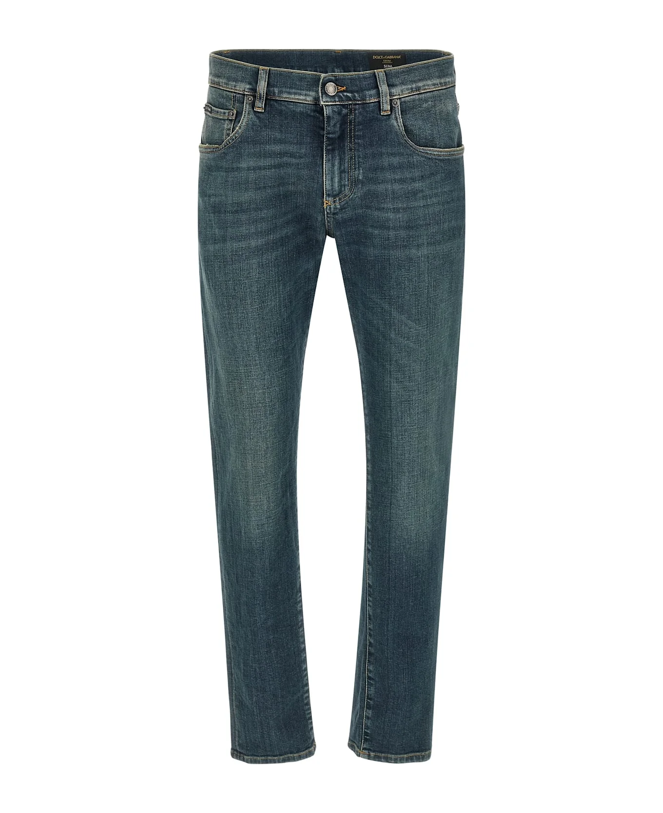 'Essential' used-effect stone washed stretch cotton denim jeans, contrast stitching, low waist, front zip and button closure, five pockets, leather patch with metal logo tag on the back. Composition: 98% cotton, 2% elastane Made in: Italy Color: Blue Size and fit: - Slim fit Model number: GY07CDG8OW9S9001