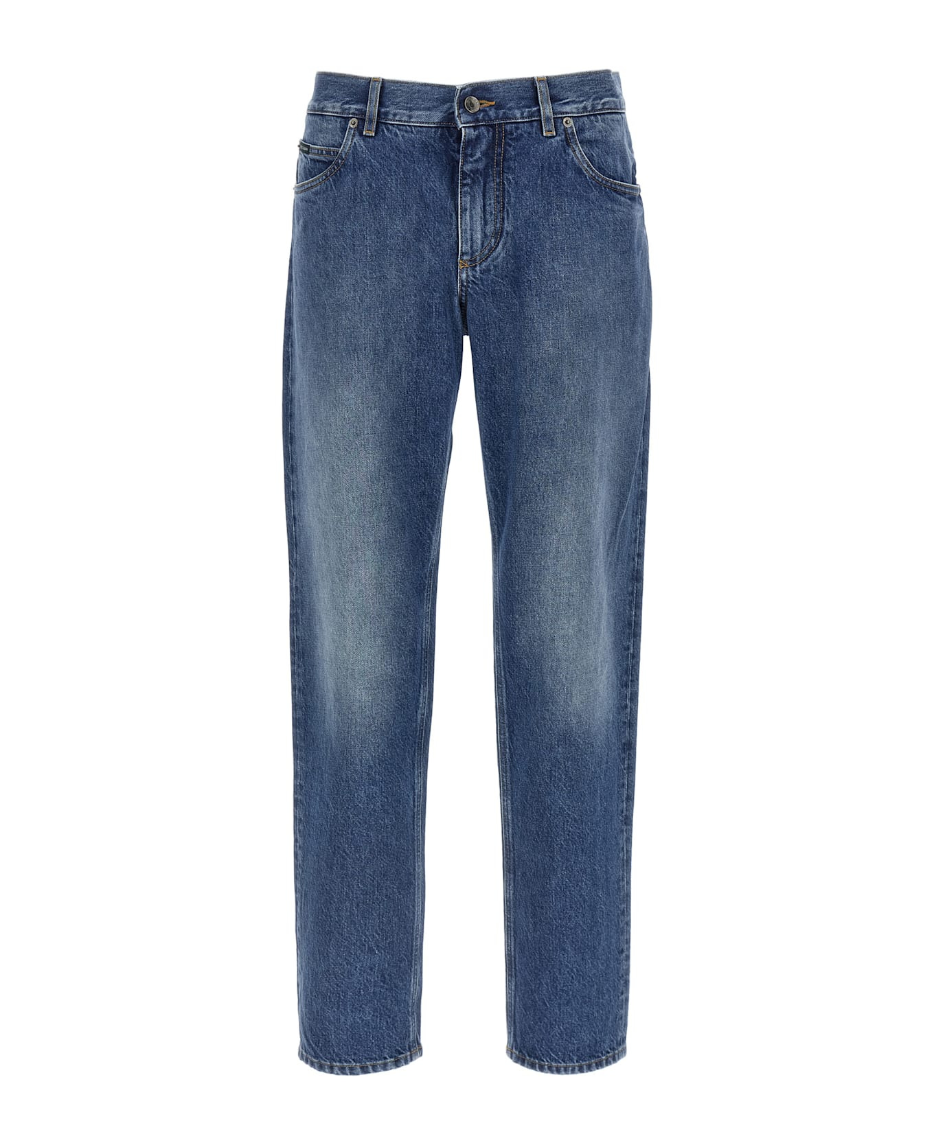 'Essential' stonewashed stretch cotton denim jeans with straight leg, front zip and button closure, five pockets, metal logo plaque on the back. Composition: 100% cotton Made in: Italy Color: Blue Size and fit: - true to size fit Model number: GYJCCDG8NU9S9001