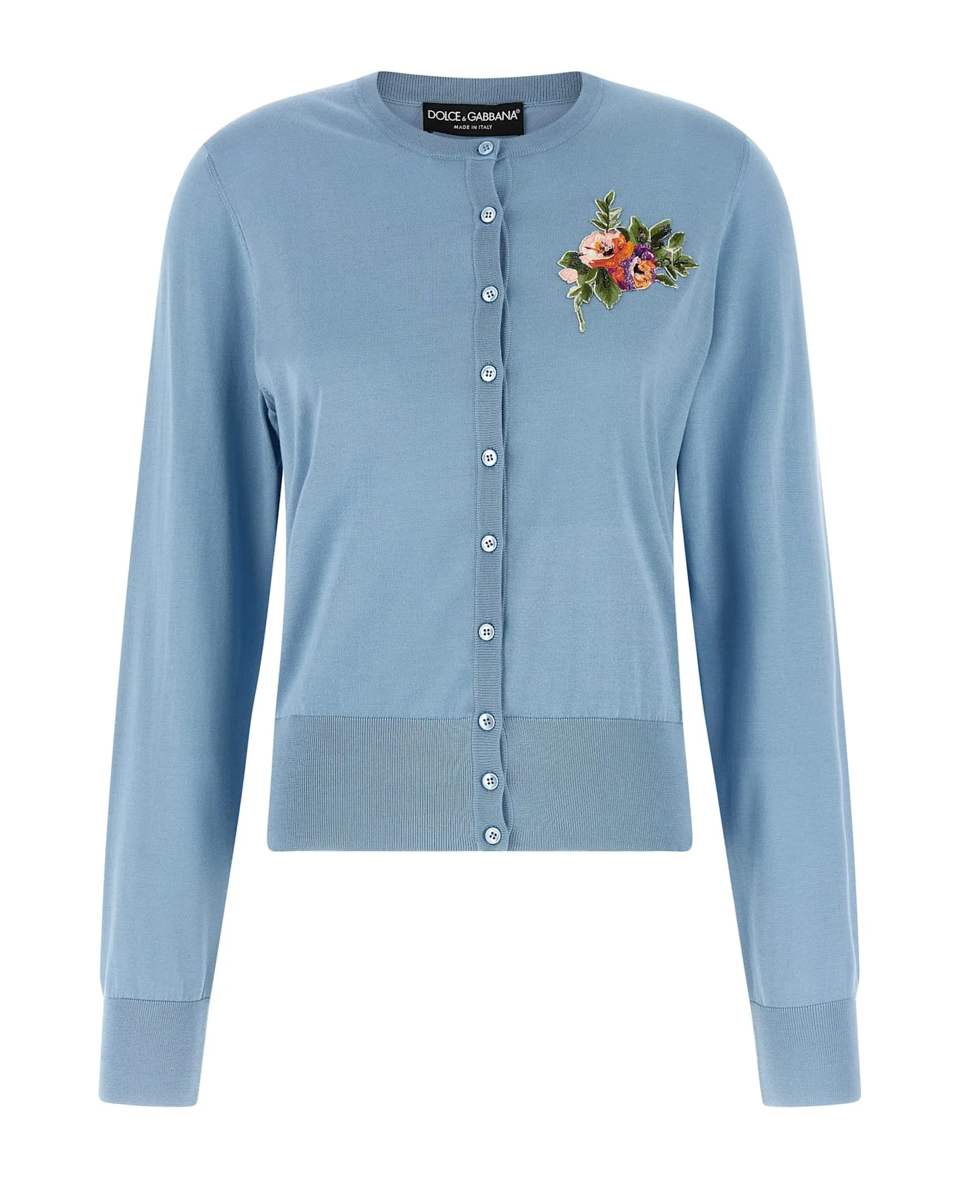 Silk cardigan, patch with floral embroidery and front beads, mother-of-pearl button closure, crew neck, long sleeves with cuffs, band on the hem. Composition: 100% silk Made in: Italy Color: Light Blue Size and fit: - true to size fit Model number: FXV07ZJBSOVB0278
