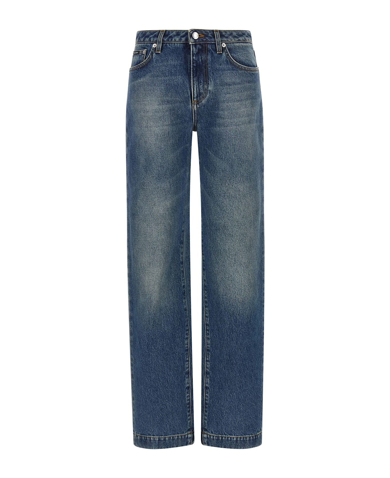 Washed cotton denim jeans, contrast stitching, low crotch, wide and straight leg, front zip and button closure, five pockets, leather and metal tag with the engraved back. Composition: 100% cotton Made in: Italy Color: Blue Size and fit: - true to size fit Model number: FTDDFDG8NV3S9001