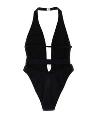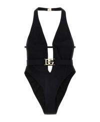 One-piece swimsuit with plunging neck and belt