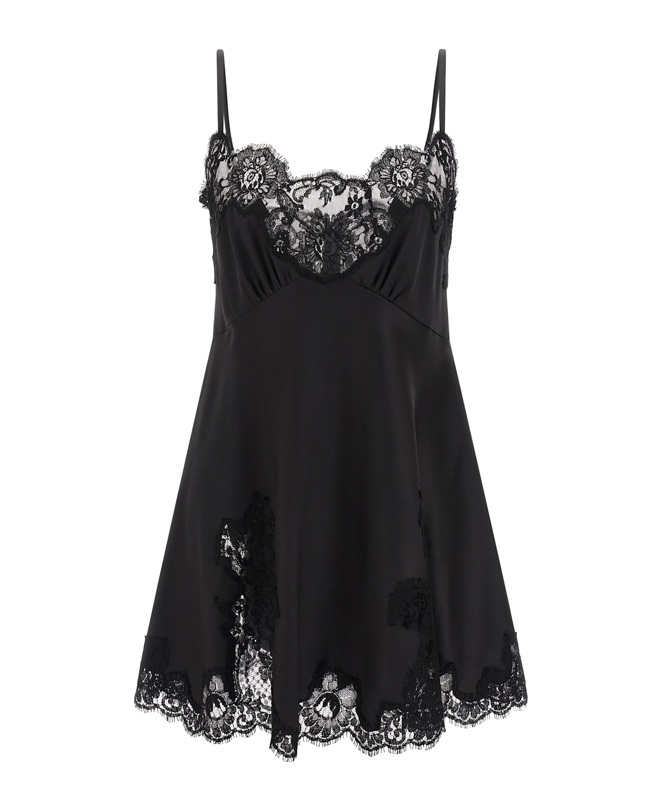 Stretch satin minidress with lace details, petticoat, flared silhouette, thin straps, sleeveless, V-neck, back zip closure. Composition: 77% silk 15% cotton 5% polyamide 3% elastane Made in: Italy Color: Black Size and fit: - true to size fit Model number: F60FFTFURAGN0000