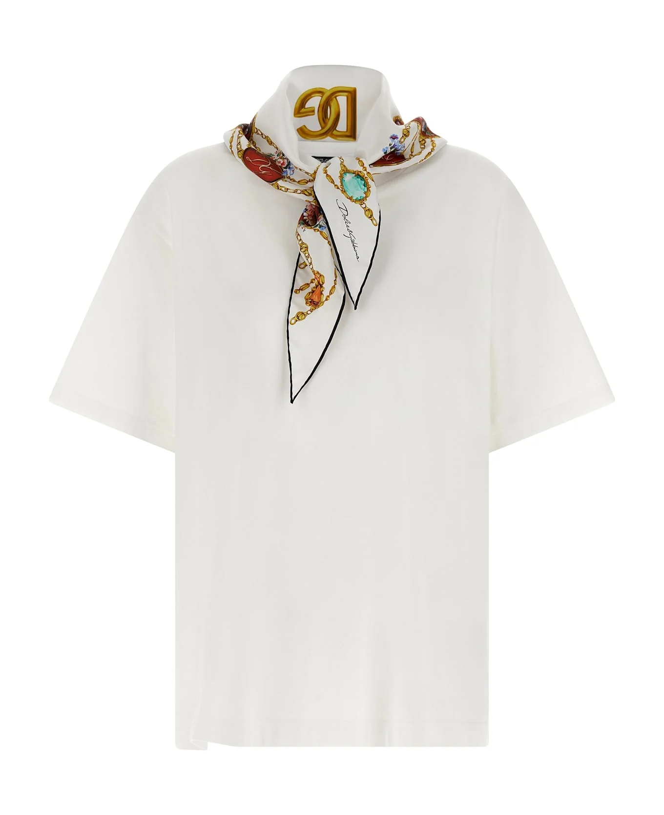 Cotton T-shirt with tone-on-tone logo embroidery on the front, crew neck, short sleeves, patterned triangle silk scarf fixed on the neckline with buttons and removable. Composition: 100% cotton Made in: Italy Color: White Size and fit: - true to size fit Model number: F8W33ZGDDPWW0800