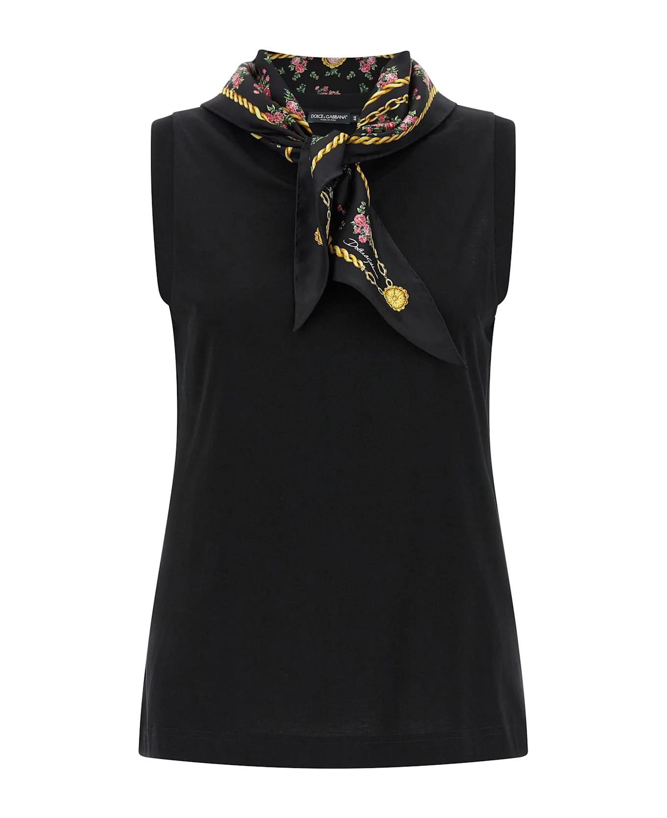 Cotton jersey T-shirt with tone-on-tone logo embroidery on the front, crew neck, sleeveless, triangle silk scarf with 'Bouquet' print fixed on the neckline with buttons and removable. Composition: 100% cotton Made in: Italy Color: Black Size and fit: - true to size fit Model number: F8W29ZGDDO7N0000