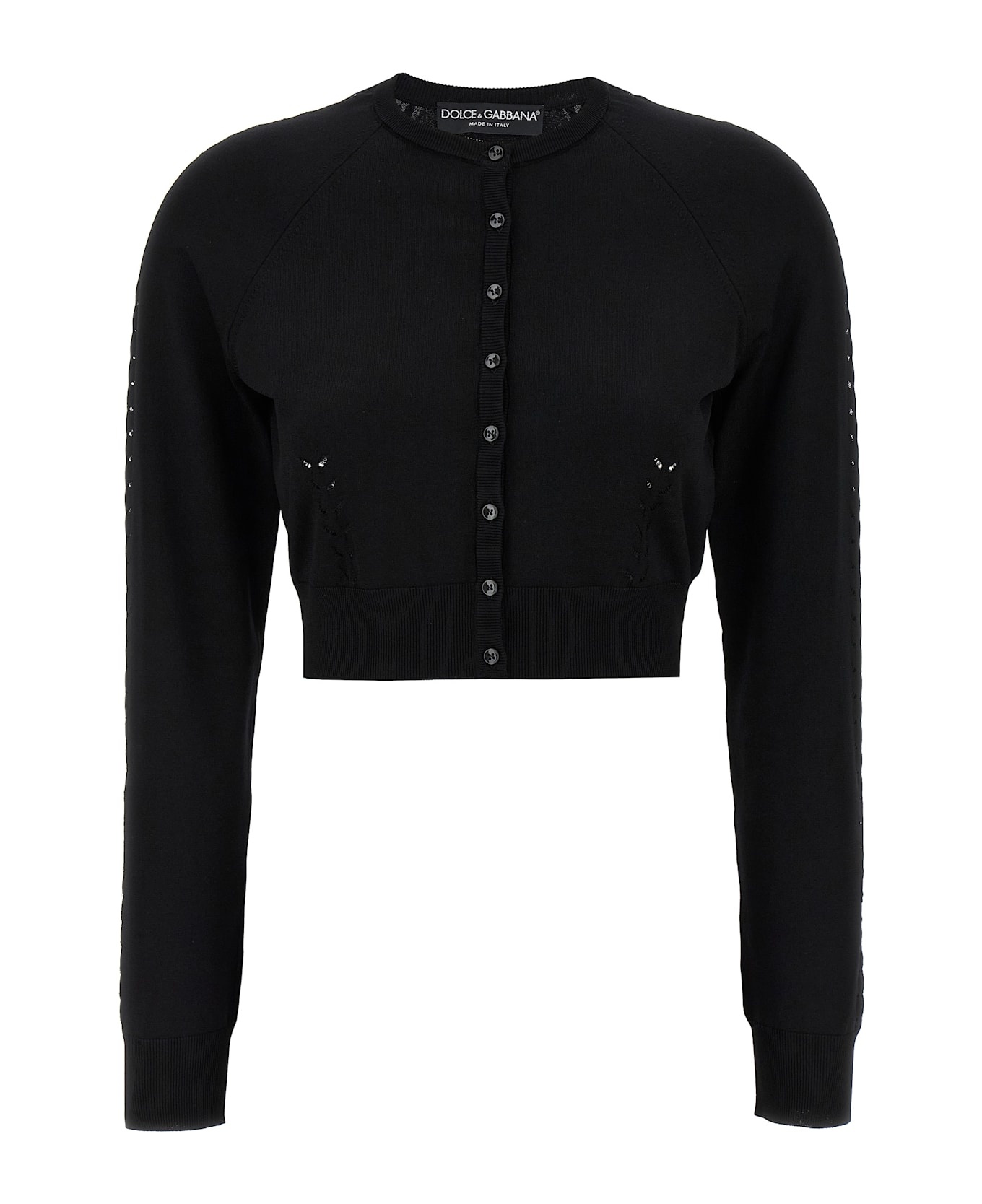 Viscose cardigan with I see I do not see, crop model, crew neck, front button closure, long sleeves with cuffs. Composition: 79% viscose 13% polyamide 8% polyester Made in: Italy Color: Black Size and fit: - true to size fit Model number: FXV88TJAIRMN0000