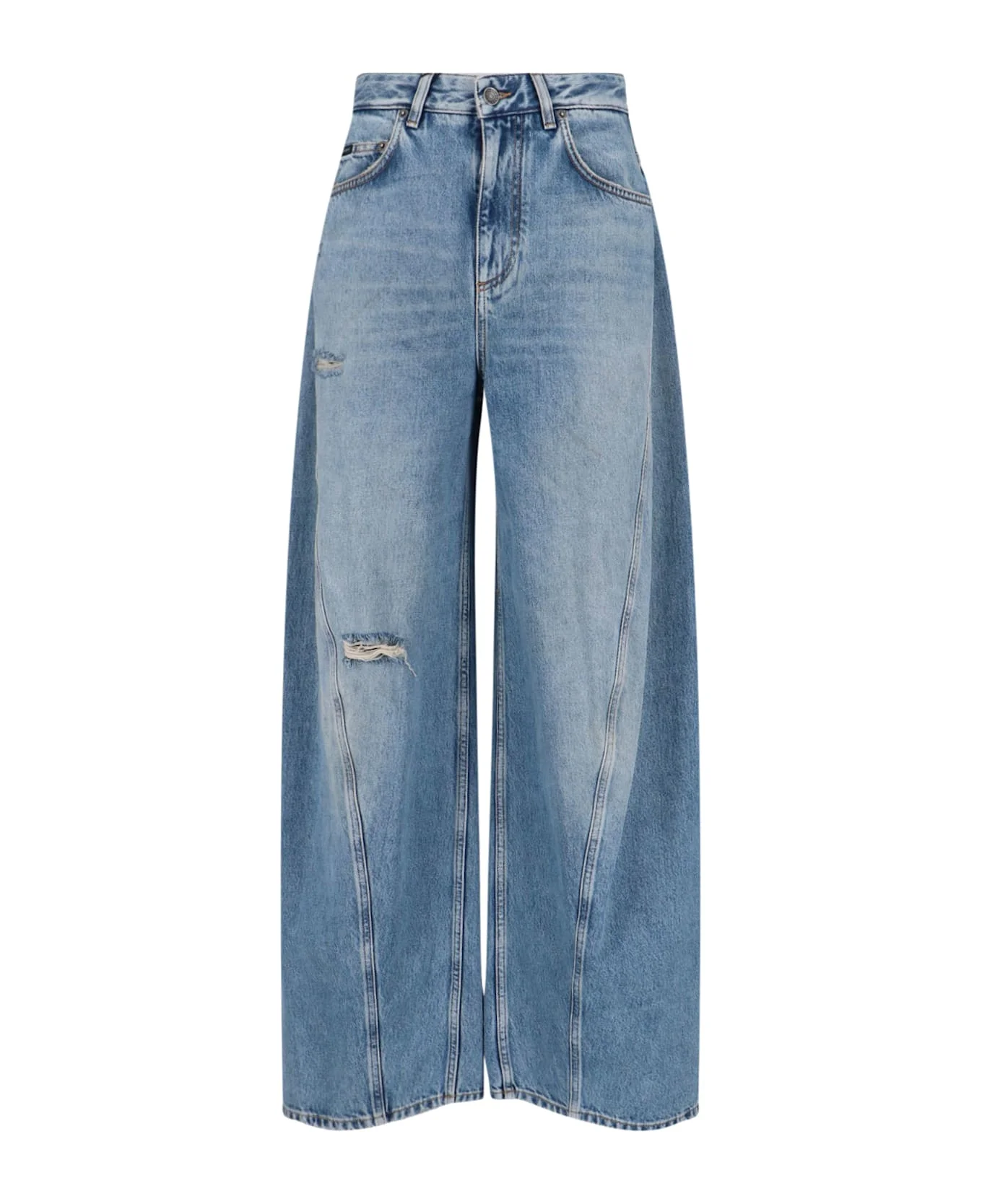 Dolce & Gabbana wide jeans in light blue cotton denim with mid waist, button and zip closure, belt loops, five pockets, logo patch on the back, metal logo tag on the back, destroyed details, wide leg. Composition: 100% Cotton Made in: Italy Color: Blue Model number: FTDHHDG8OR6S9001
