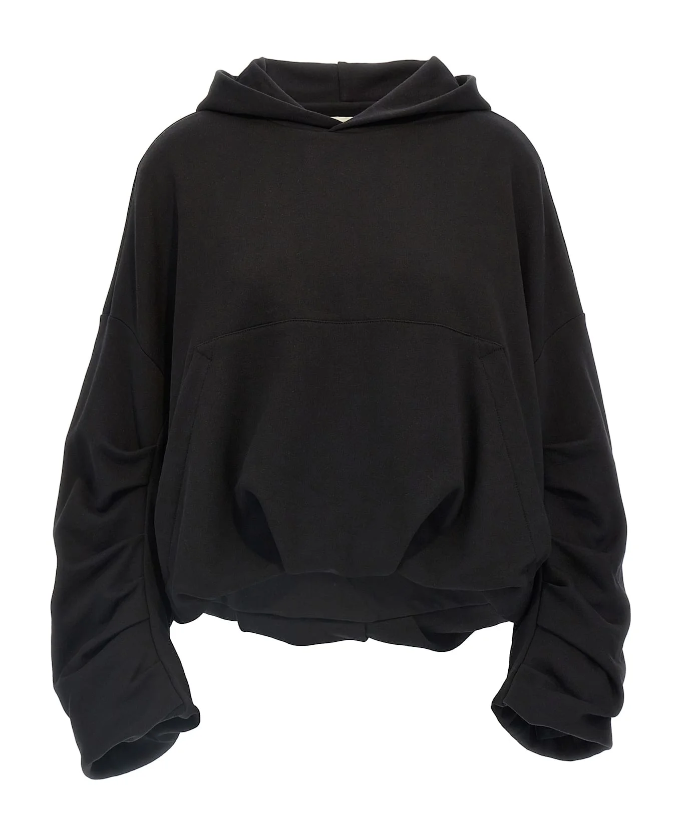 'Hannett' double-sided cotton hoodie with boxy style with rolled hem on the hem, kangaroo pocket, long pleated sleeves with dropped shoulders. Composition: 100% cotton Made in: Turkey Color: Black Size and fit: - Oversized fit Model number: 2520111282611900