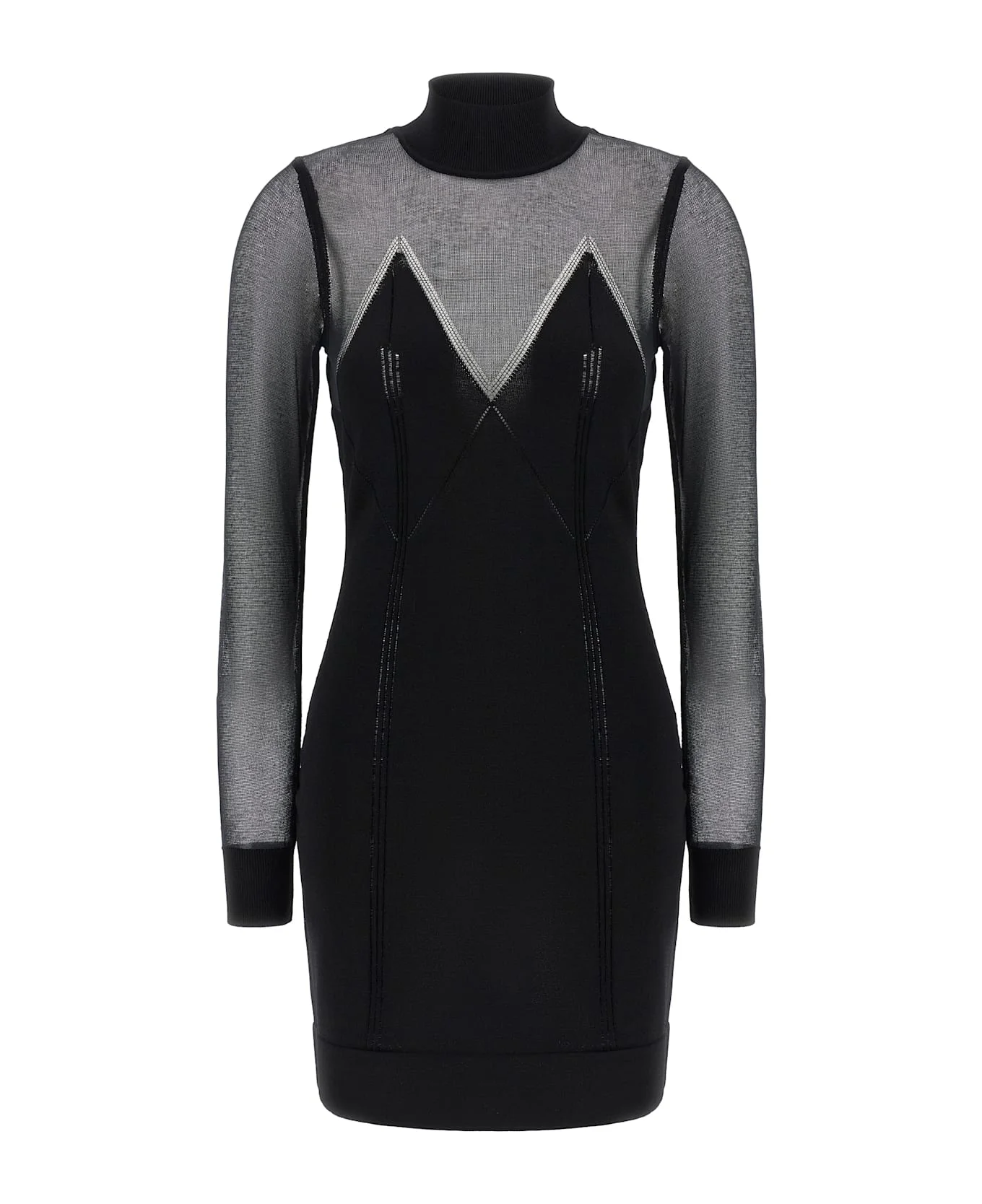 Mini dress in viscose and stretch cotton blend with superior transparencies, high neck, long cuffed sleeves, and band on the hem. Composition: 59% vi, 33% pa, 8% co Made in: Italy Color: Black Size and fit: - Slim fit Model number: AM95Q61E2110