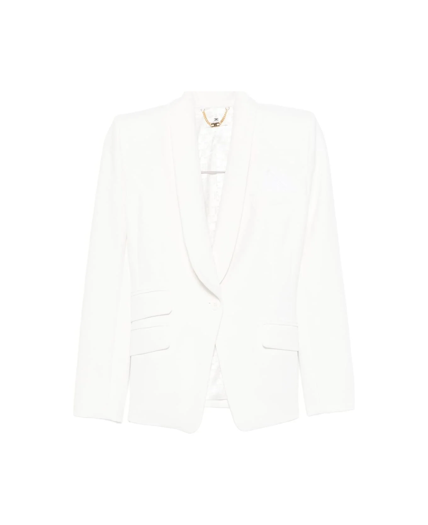 Elisabetta Franchi Suit with Shawl Lapels Origin: Italy Features White Shawl lapels Single-breasted Long sleeves Flap pockets Composition Lining: 97% polyester, 3% elastane Outer: 100% cotton, 95% polyester, 5% elastane Color: White Model number: TP00156E2360