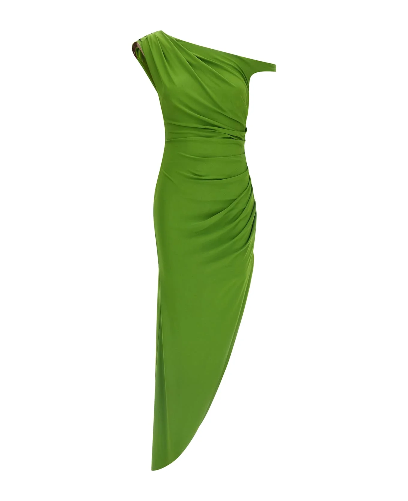 One-shoulder dress in crepe jersey with jeweled padded shoulder strap, boat neck, drapes and side zip closure, and wide slit with asymmetric hem. Composition: 95% viscose, 5% elastane Made in: Italy Color: Green Size and fit: - Slim fit Model number: AB90661E2EV3