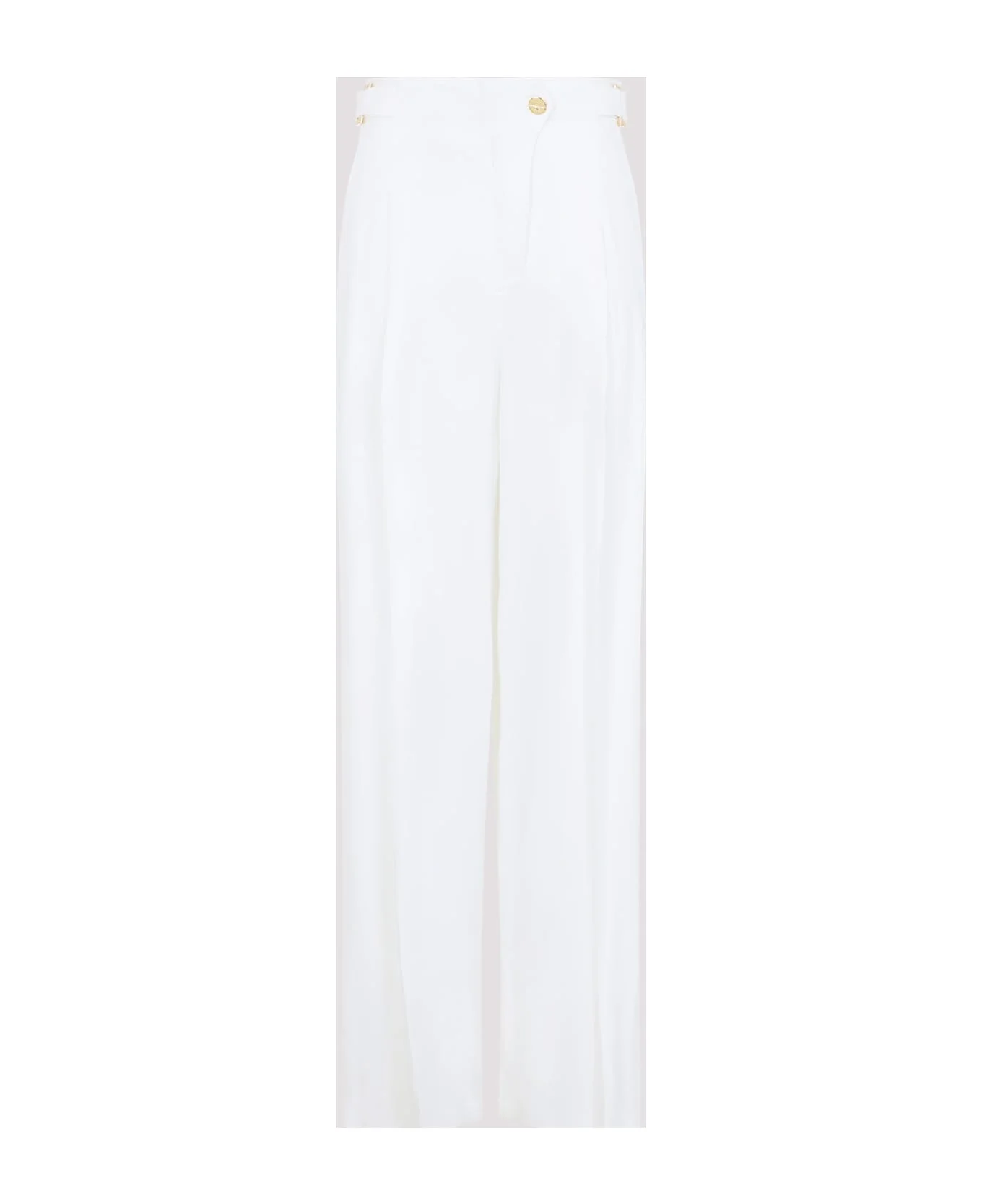 Elisabetta Franchi Ivory Linen Pants. Crafted from ivory linen and viscose, featuring a high waist, side waist straps with gold-toned buckles, a front button with a diagonal zip fly, front darts, side pockets, two welt pockets on the back, and a wide leg. Made in: Italy Color: Avorio Model number: PA12762E2360