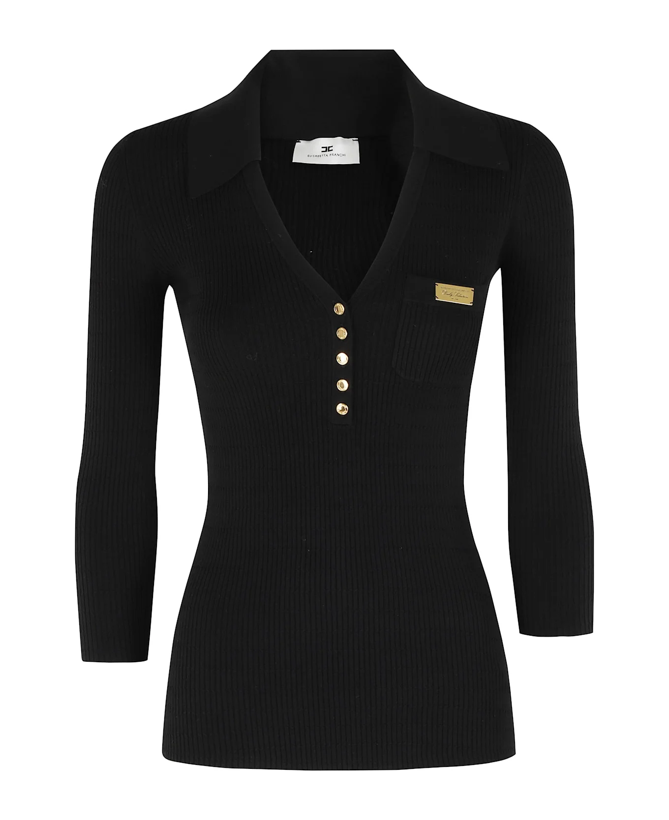 Category: Sweater Article: Polo Shirt Brand: Elisabetta Franchi Color: Black Neckline: Polo collar with V-neck Details: Gold metal buttons with nameplate on chest SIZE AND FIT Fit: Slim Sleeve: Three-quarter length Made in: China Color: Nero Model number: MK86B61E2|098110
