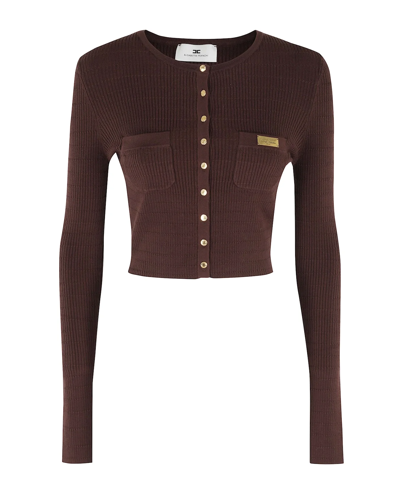 Category: Knitwear Article: Knitted cardigan with micro-braids Brand: Elisabetta Franchi Color: Brown Neckline: Round Details: Tab on the noseband Closure: Button closure SIZE AND FIT Fit: Slim Length: Cropped Sleeve: Long Made in: China Color: Cacao Model number: MK88B61E2|098644