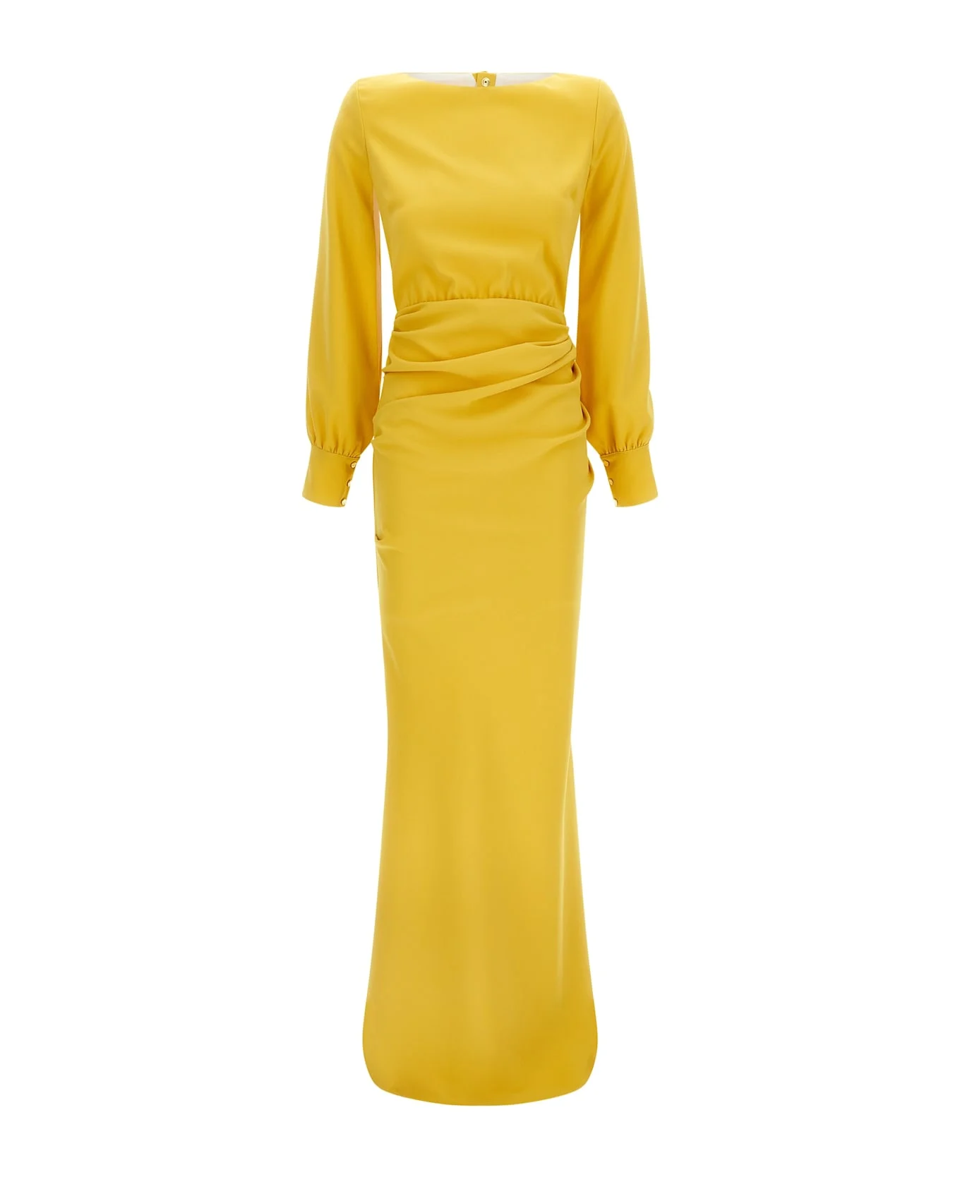 'Red Carpet' long dress in light crepe, boat neck, padded shoulders, long cuffed sleeves and open interior, large back cut-out with snap button and zip closure, front and back curls, mermaid skirt, satin lining. Composition: 98% polyester, 2% elastane Made in: Italy Color: Yellow Size and fit: - Slim fit Model number: ABR2861E2FA5