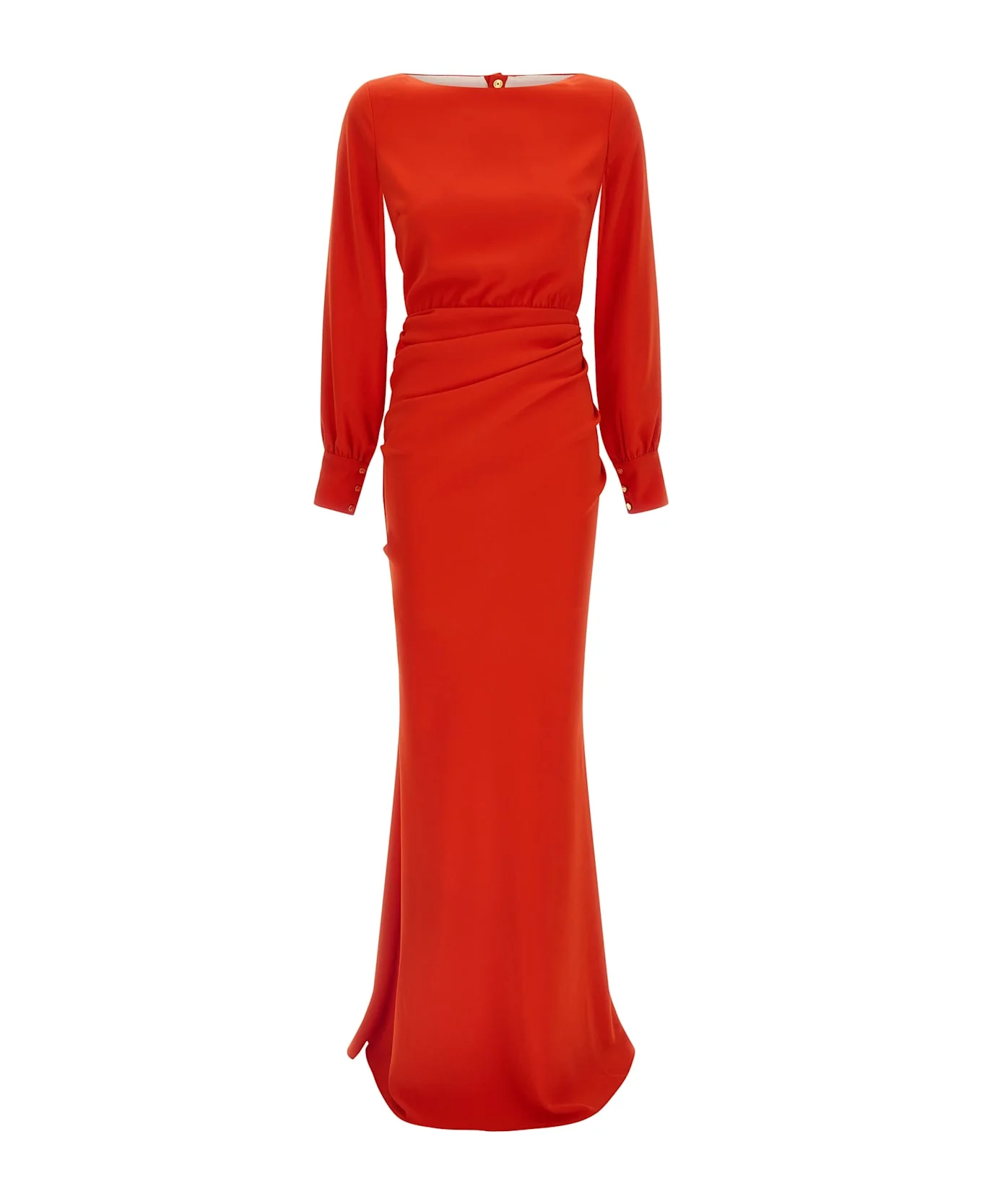 'Red Carpet' long dress in light crepe, boat neck, padded shoulders, long cuffed sleeves and open interior, large back cut-out with snap button and zip closure, front and back curls, mermaid skirt, satin lining. Composition: 98% polyester, 2% elastane Made in: Italy Color: Red Size and fit: - Slim fit Model number: ABR2861E2U99