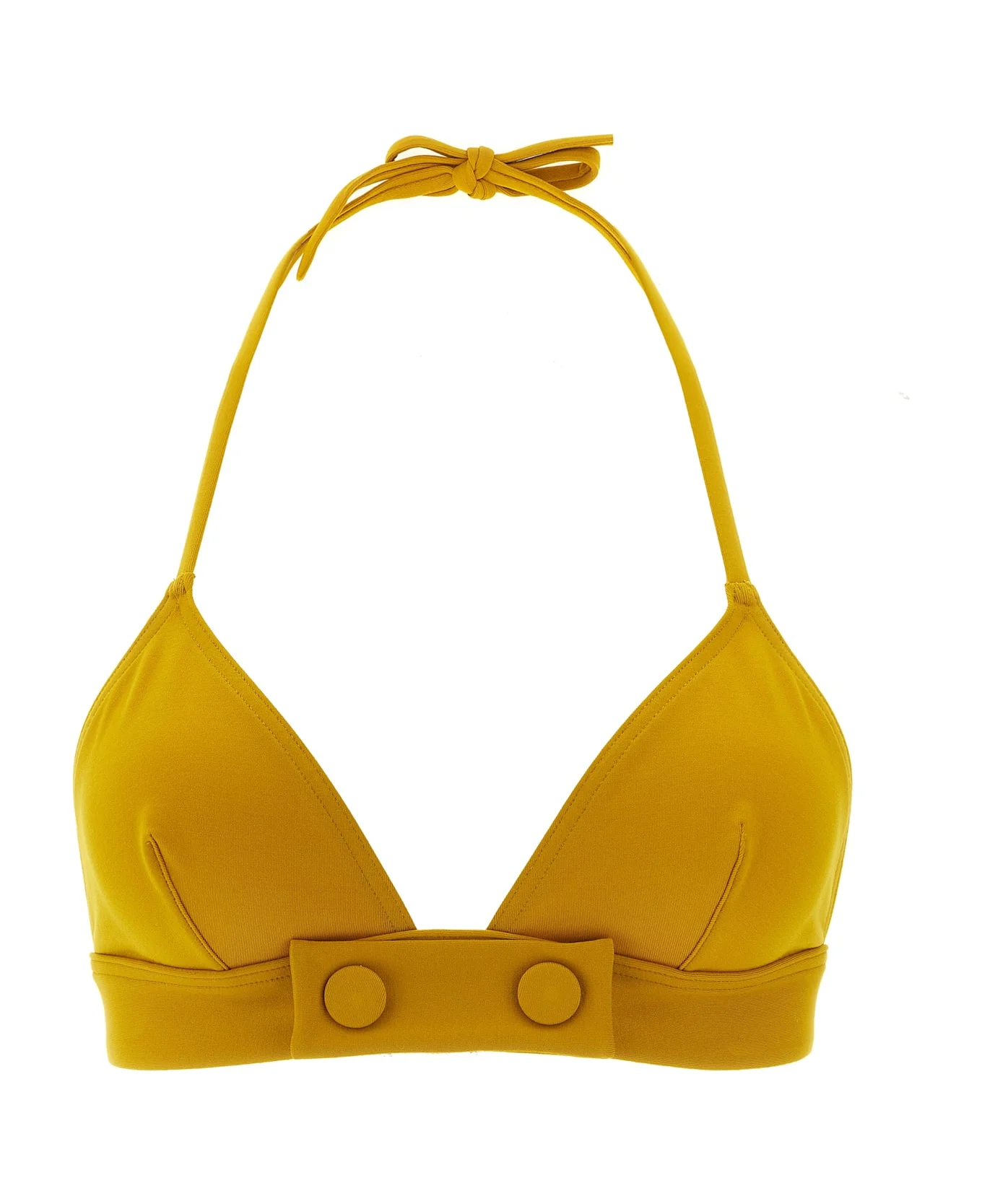 Bord' triangle bikini top in Peau Douce* fabric with front trompe l'oeil snap buttons, adjustable neck strap and back hook. Composition: 84% polyamide, 16% elastane Made in: France Color: Yellow Size and fit: - True to size fit - French sizing Model number: 032601OR26A