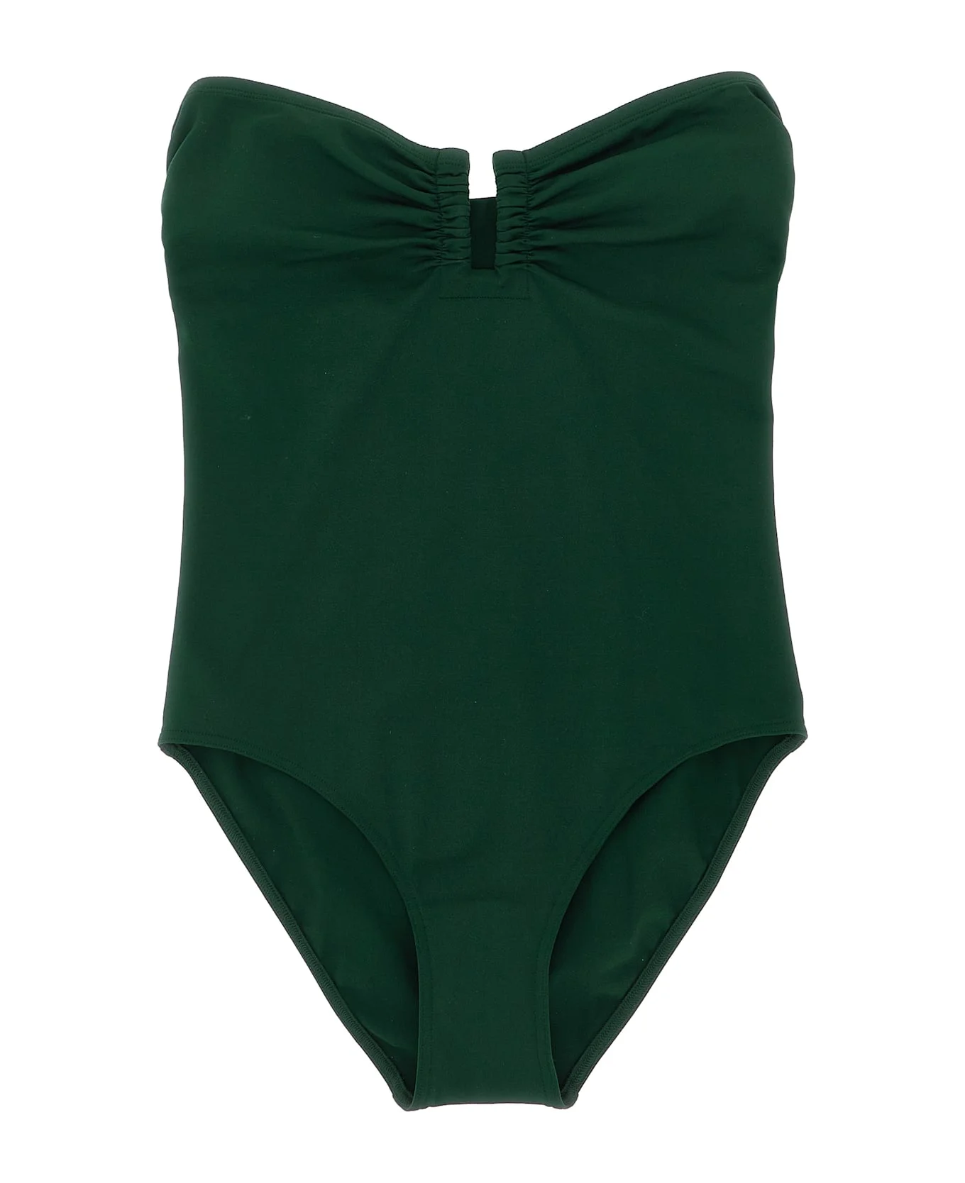 'Cassiopee' one-piece swimsuit in Peau Douce* fabric, off-the-shoulder style with cups separated by a U-shaped underwire. Composition: 84% polyamide, 16% elastane Made in: Italy Color: Green Size and fit: - True to size fit - ERES size Model number: 011406SCARABEE