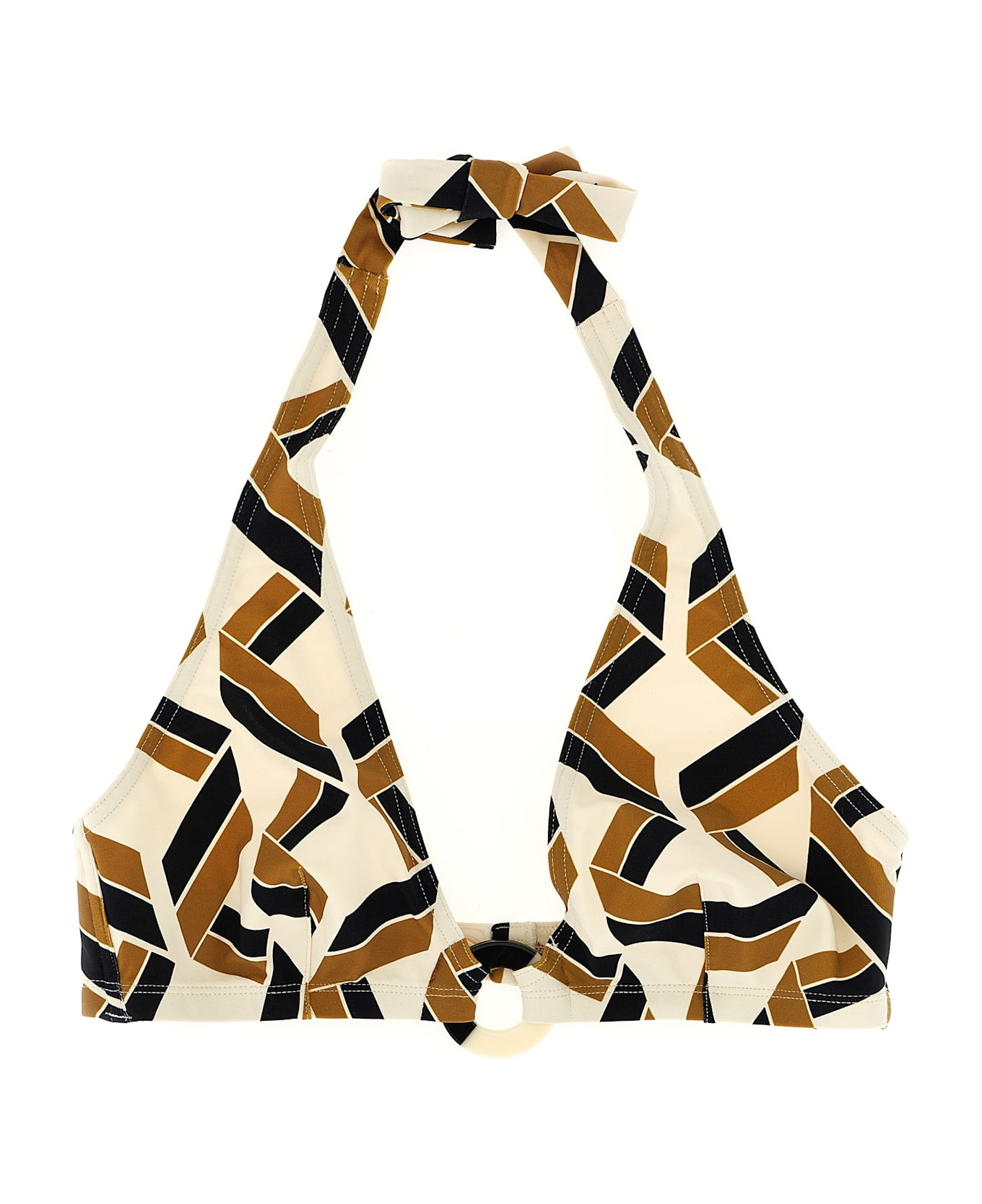 'Dimension' bikini top in Peau Douce fabric with Seventies print, triangle containment model with breast clamp and side underwires, two-tone Plexiglas ring between the cups, adjustable neck strap and back hook. Composition: 77% polyamide, 23% elastane Made in: France Color: Multicolor Size and fit: - True to size fit - ERES size Model number: 032525IMPRIMESWIMNOIR