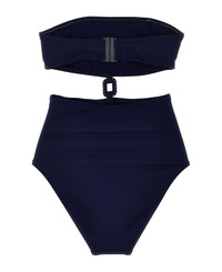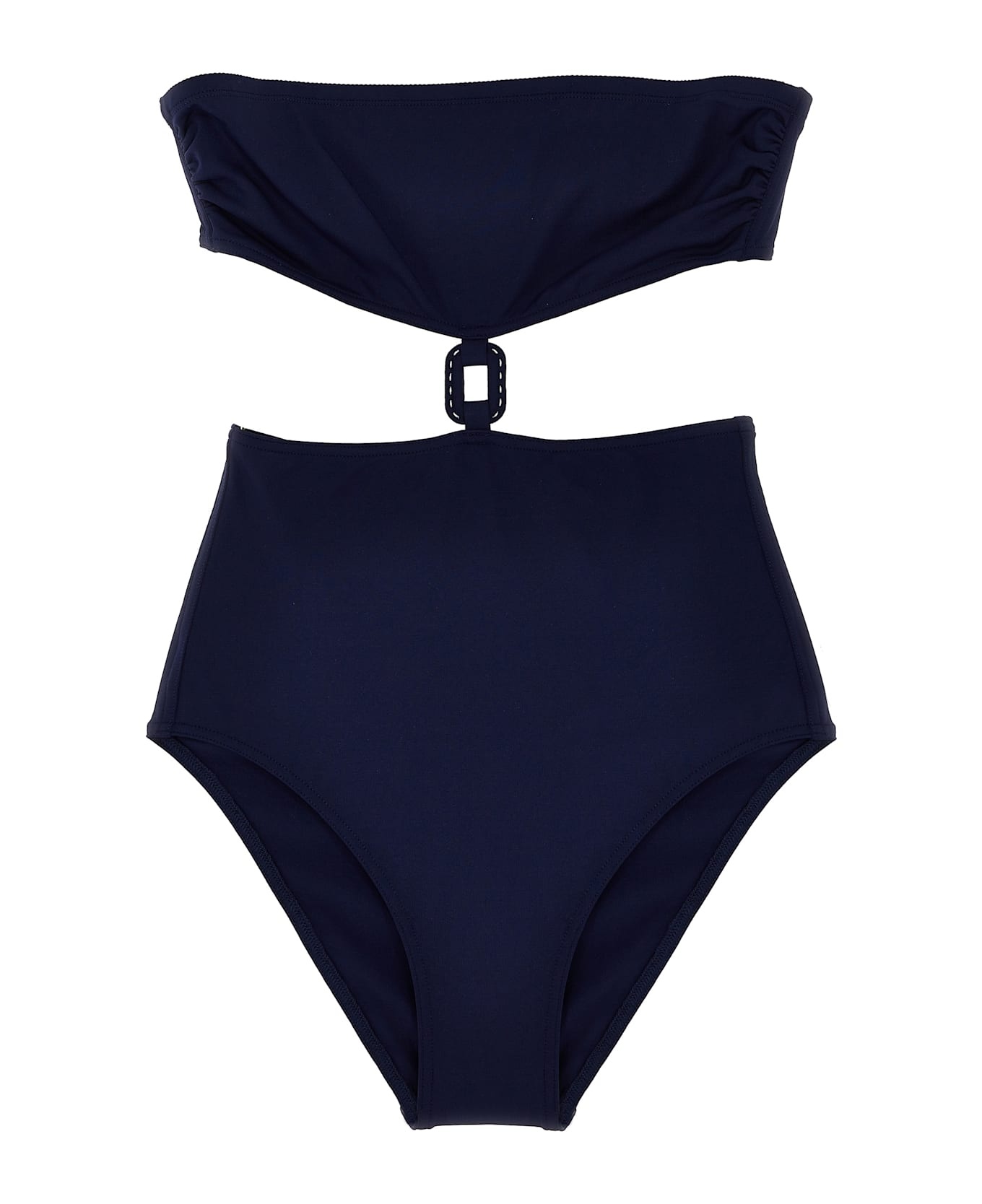 'Marina' one-piece swimsuit in Peau Douce* fabric with trikini style with non-slip band bustier, pleats and side underwires, back hook closure, front central decorative buckle and high waist briefs. Composition: 77% polyamide 23% spandex Made in: France Color: Blue Size and fit: - true to size fit Eres size Model number: 012514NAUTIQUE