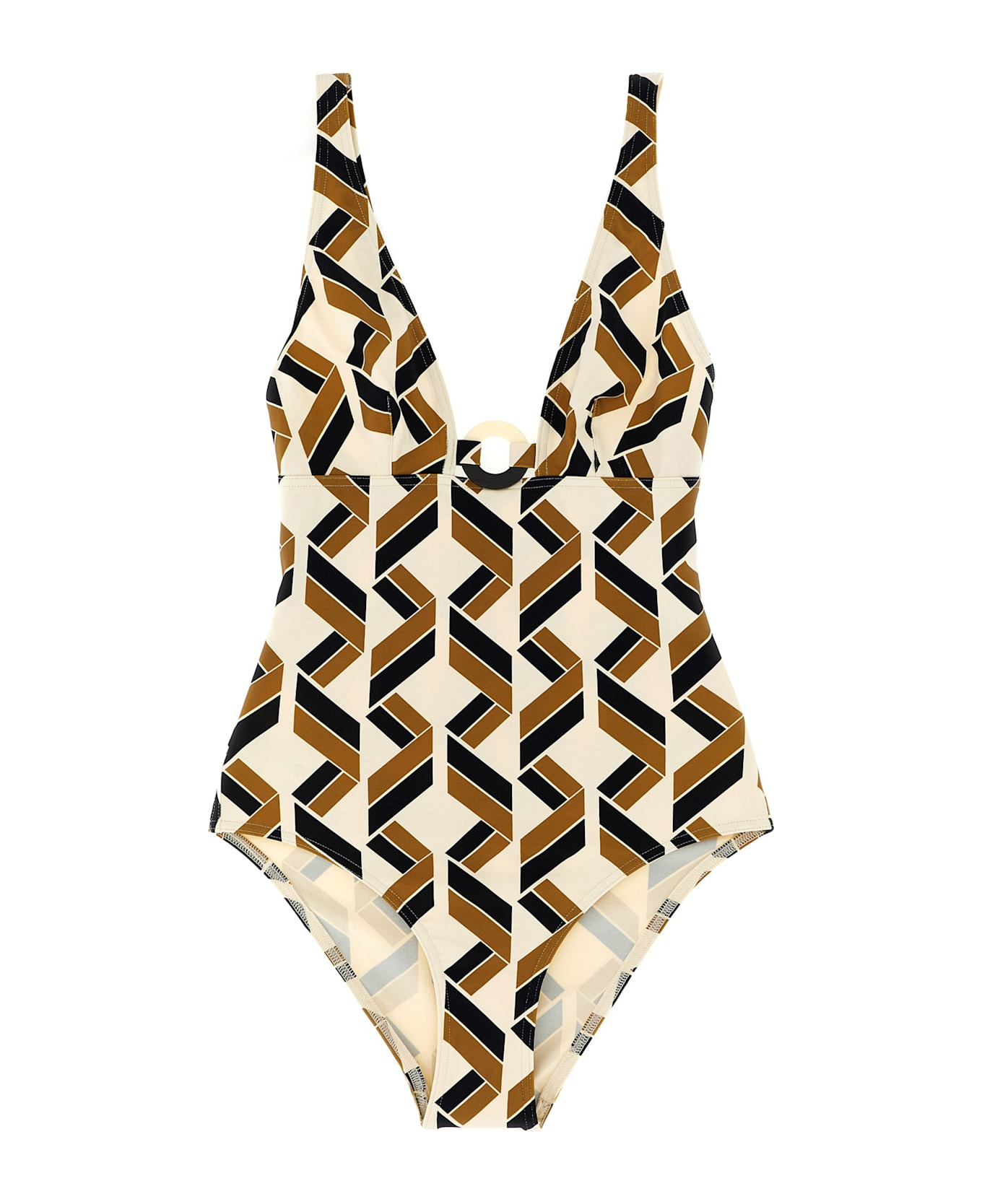 'Party' one-piece swimsuit in Peau Douce fabric with Seventies print, V-neck with two-tone Plexiglas ring detail, wide straps, underbust stitching and breast pincery, classic coverage. Composition: 77% polyamide, 23% elastane Made in: France Color: Multicolor Size and fit: - True to size fit - ERES size Model number: 012541IMPRIMESWIMNOIR