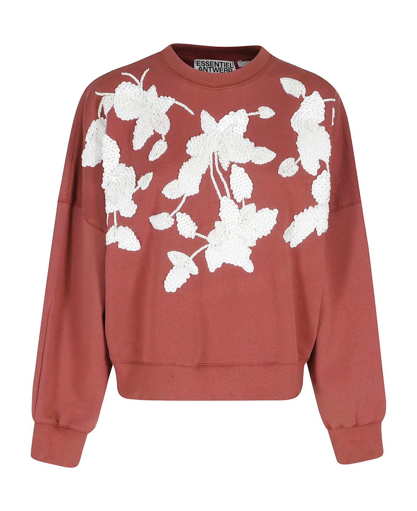 Category: Sweatshirt Item: Jaga Sweatshirt Brand: Essentiel Antwerp Color: Brick Neckline: Ribbed crew neck Details: Dropped shoulders, Sequin embroidery and contrasting beads SIZE AND FIT Fit: Relaxed Sleeve: Long with ribbed cuff Made in: India Color: Er Model number: JAGA|098Combo4