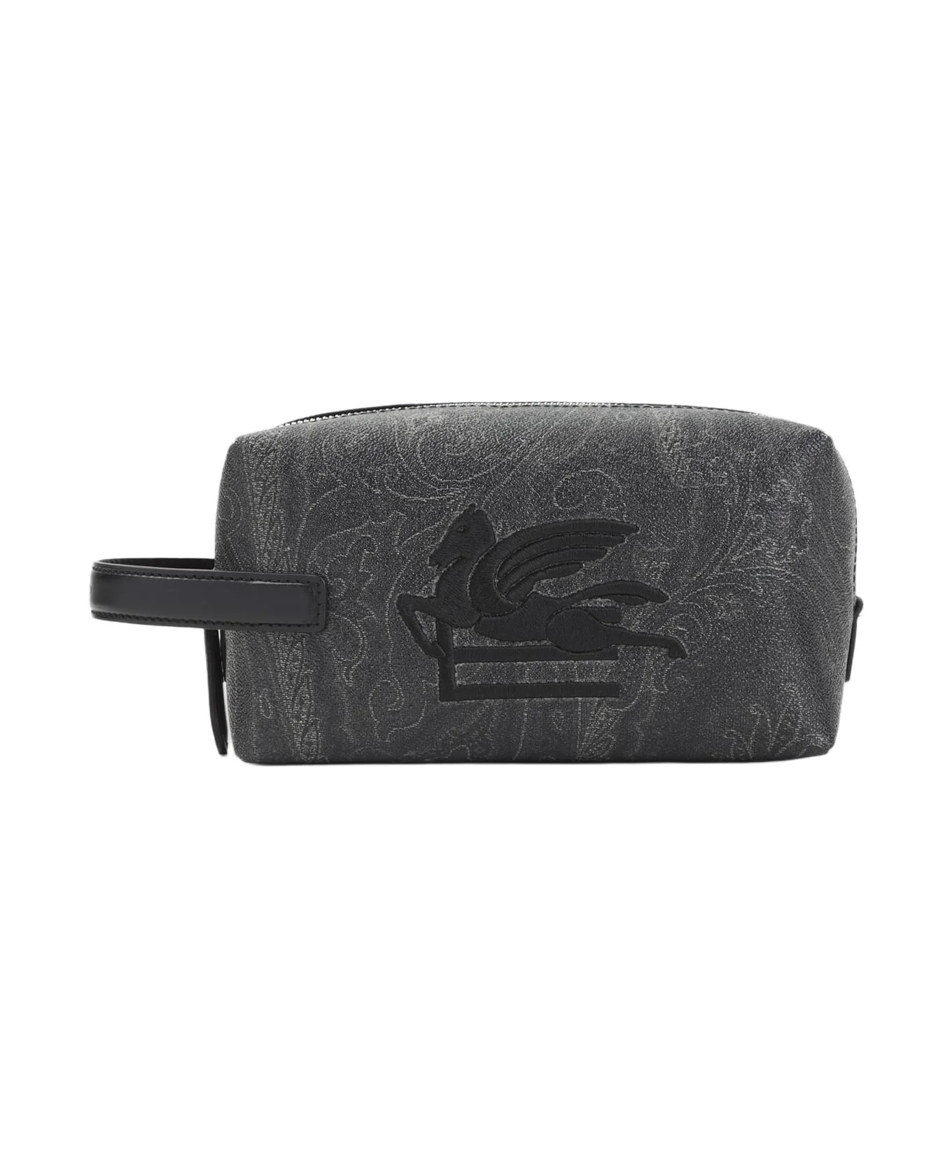 Etro Black Cotton Arnica S Pouch. Crafted in cotton and polyester. Top zipped fastening, front black embroidered logo, side black strap, one main compartment. Grey flower pattern design, silver-tone hardware. Made in: Italy Color: Black Size and fit: - W:19,5cm H:10cm D:8cm Model number: MP2C0009AA086N0000