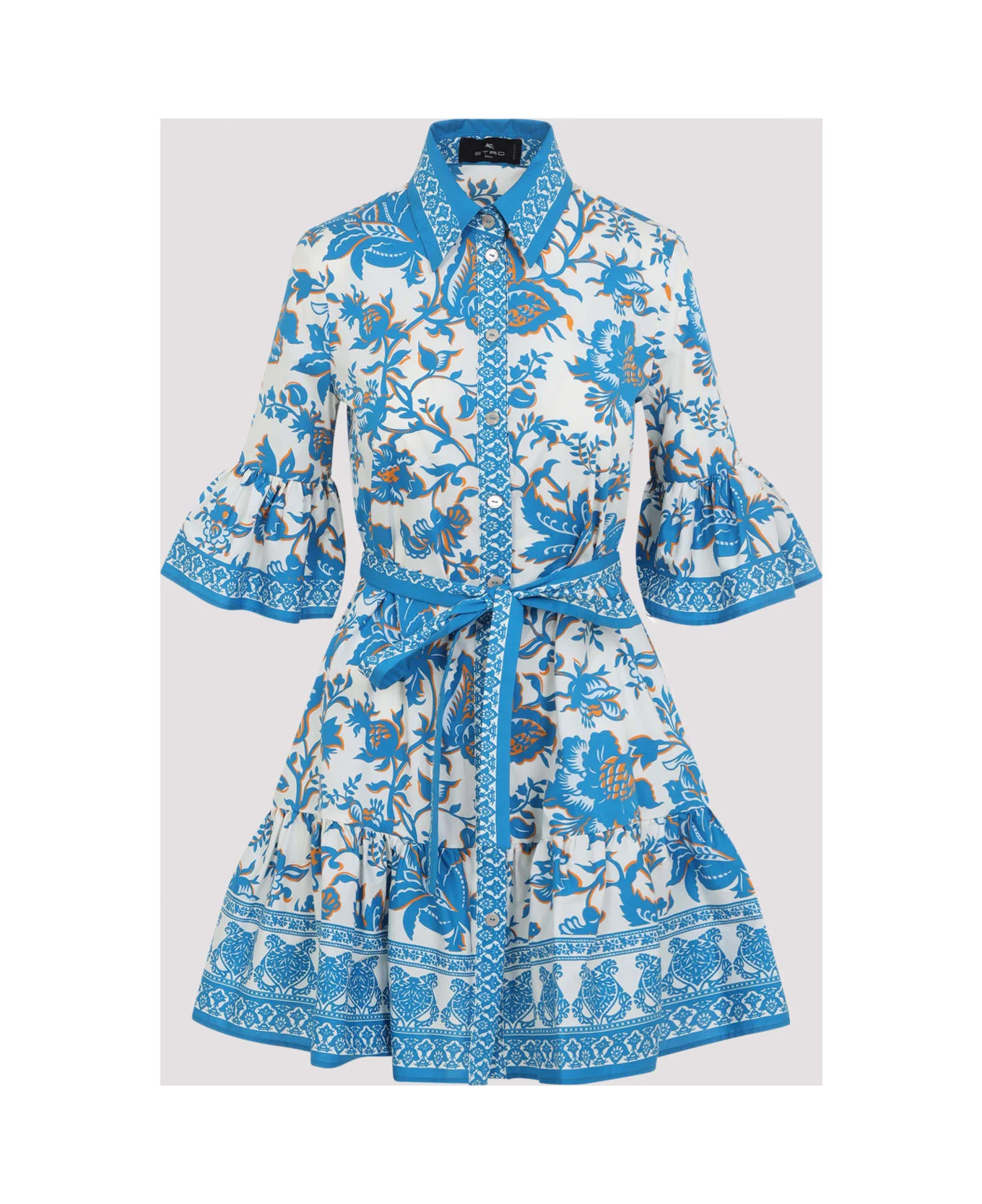 Etro Belt White Cotton Mini Dress. Crafted from white cotton with an all-over signature floral print, featuring a pointed collar, front button fastening, a tonal self-tie belt at the waist, three-quarter sleeves with ruffled details, and a flared midi skirt. Made in: Italy Color: Multi White Model number: WRHA0585AKH16X0807