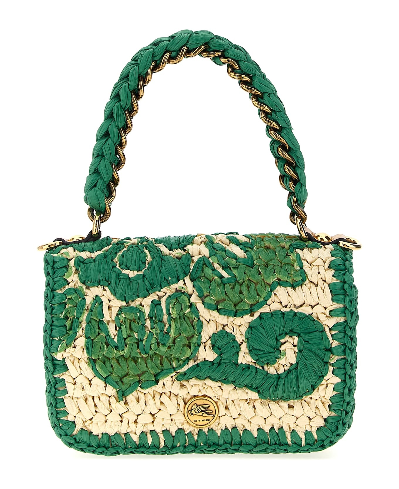 'Bond XS' woven raffia handbag with floral motif, leather and metal details, suede lining, magnetic flap closure with metal button with Pegaso logo on the front, fixed raffia and chain handle, adjustable and removable leather shoulder strap. Composition: 100% paper Made in: Italy Color: Green Size and fit: - W 18 x H 13 x D 5 cm Model number: WP1B0006AK558V0556