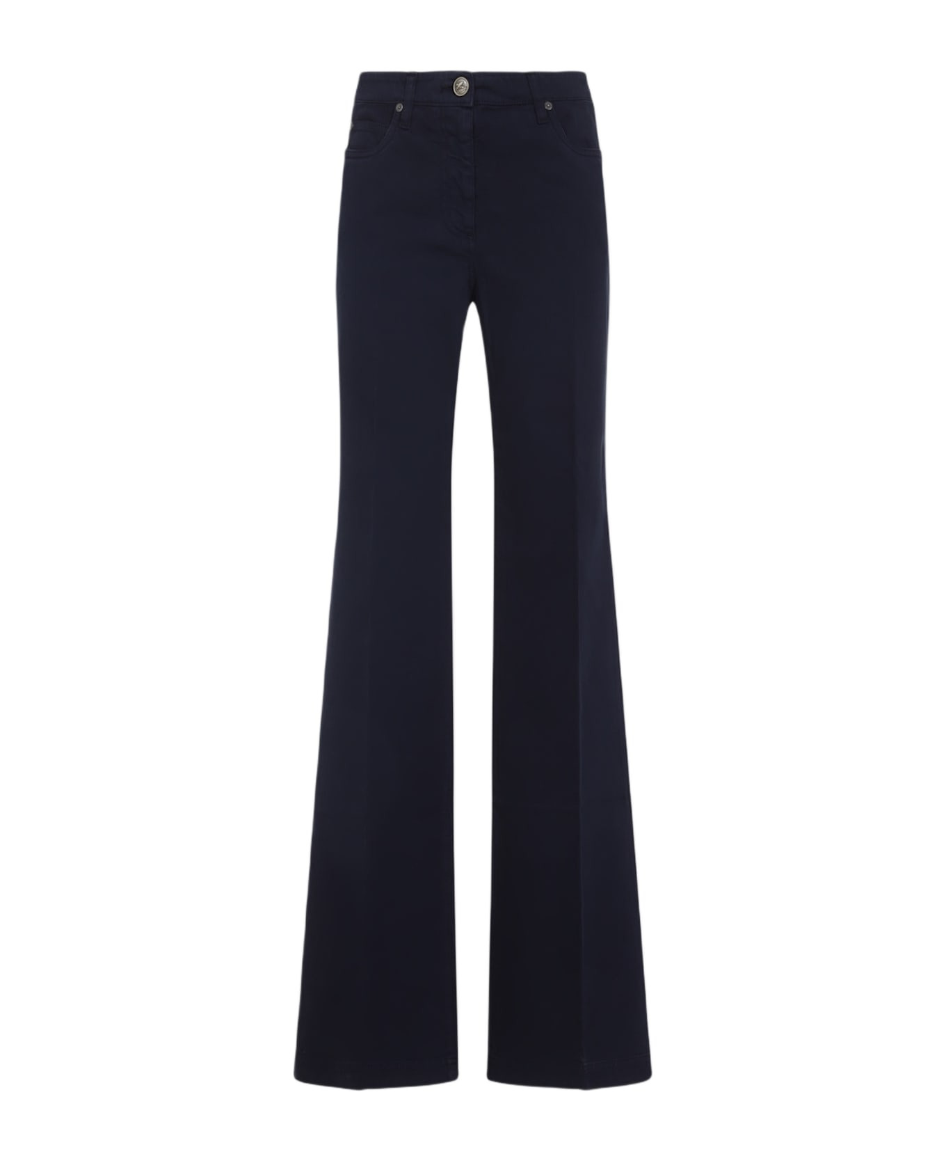 Etro Denim Blue Cotton Jeans. Crafted from dark blue cotton denim, mid-rise, 5-pocket design, belt loops, front button and fly-zip fastening, leather logo patch at the back waistband, embroidered logo at the back pocket, slightly flared, wide leg. Made in: Italy Model number: WRNB0026AV689B0387