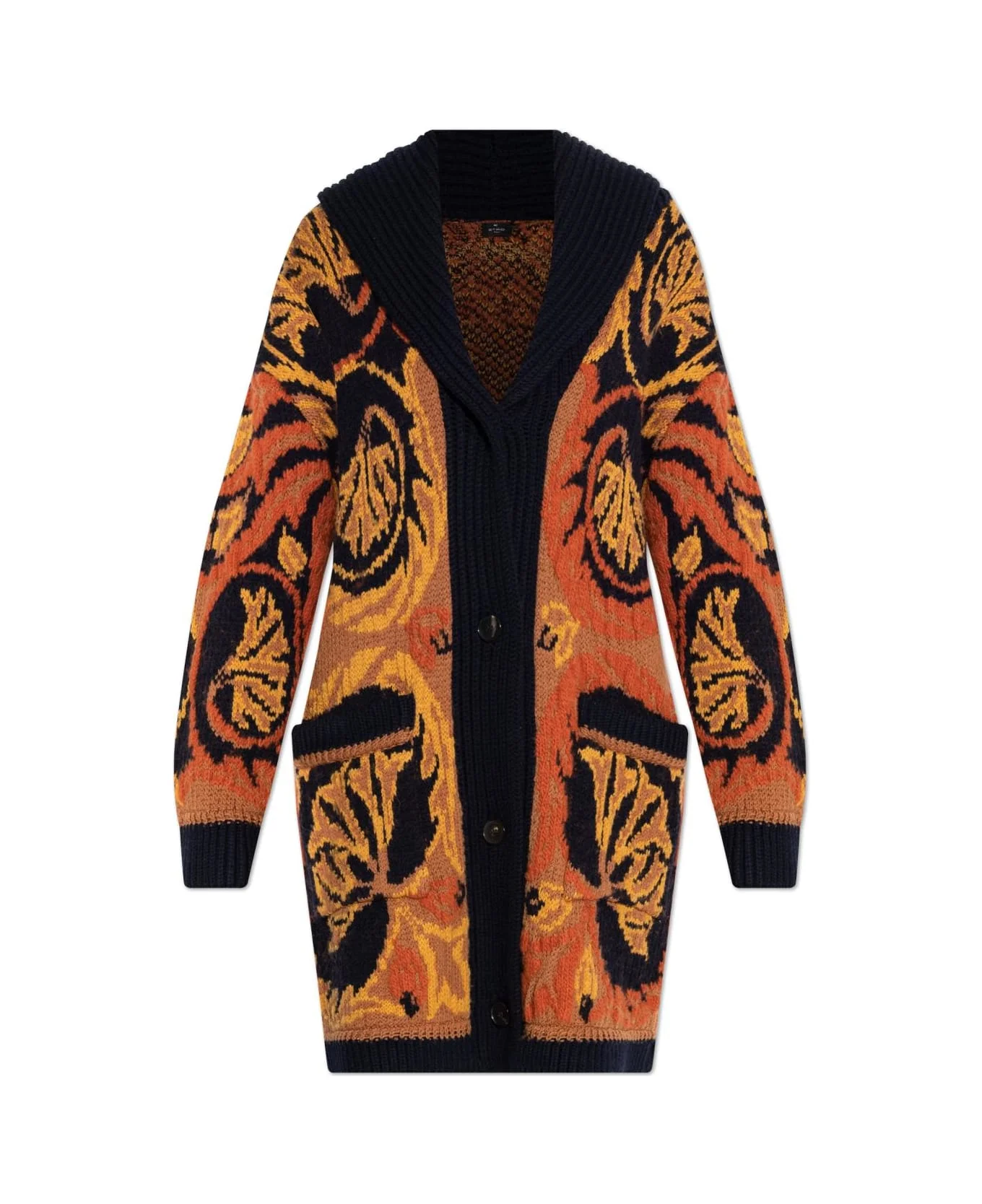Experience modern luxury with the Patterned Relaxed-Fit Cardigan by Etro, a distinguished Italian house renowned for artful silhouettes and sumptuous fabrics. This oversize cardigan gracefully drapes to mid-thigh, with an elongated shoulder line and voluminous sleeves that effortlessly evoke sophisticated nonchalance. Crafted from a robustly textured knit, composed of premium wool blended with alpaca, the piece envelops you in warmth and tactile elegance. An intricate, nature-inspired motif echoing stylized leaves and botanical arabesques adorns the entire surface, harmoniously balanced on a vivid orange canvas with deep navy, yellow, and beige accents. Authentic to Etro's heritage, the statement paisley-inspired patterns echo the vibrant artistry of Asian design, epitomizing the brand's Milanese roots and creative spirit. Why choose this product? Exceptional comfort from a luxuriously thick, soft knit. Signature Etro artistry each sweater displays unique botanical motifs. Relaxed, versatile silhouette perfect for layering and seasonless wear. An iconic statement piece from a prestigious family-run fashion house. Composition: 89% Wool 89% Wool 89% Wool 6% Alpaca 6% Alpaca 6% Alpaca 5% Acrylic 5% Acrylic 5% Acrylic Made in: Italy Color: ORANGE Model number: AQ168WRKE0162