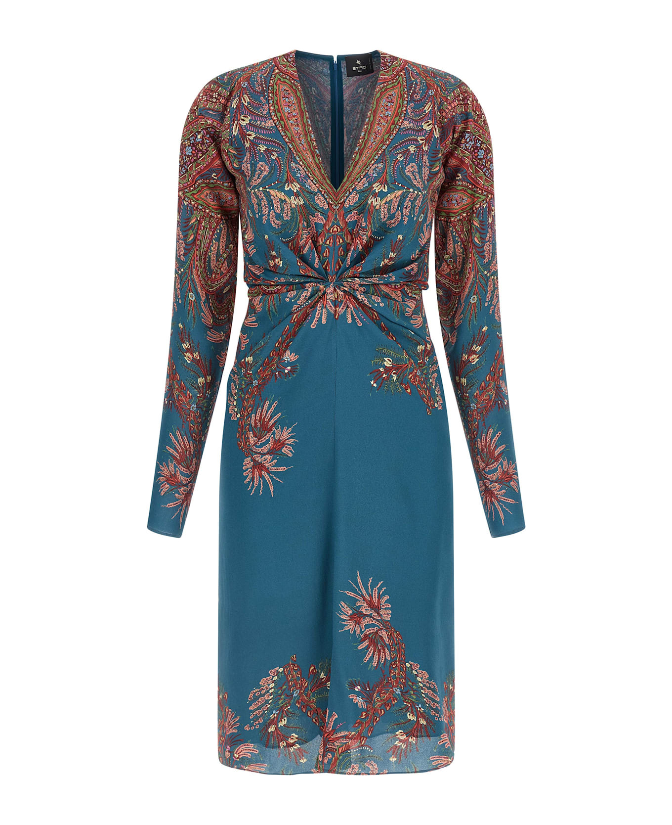 Floral print viscose midi dress, front drape, V-neck, long sleeves, back zip closure, underskirt. Composition: 97% viscose, 3% elastane Made in: Italy Color: Blue Model number: WRHA027199SP4G4X0883