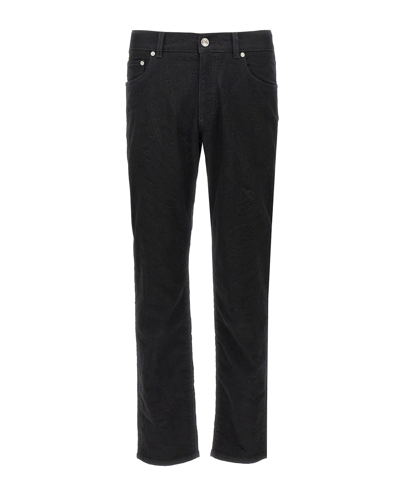 All-over tone-on-tone jacquard stretch cotton blend denim jeans, five pockets, zip and button closure, back leather logo tag. Composition: 56% cotton 41% polyester 3% elastane Made in: Italy Color: Black Size and fit: - Rome fit Model number: MRNB000599TTE17S9093