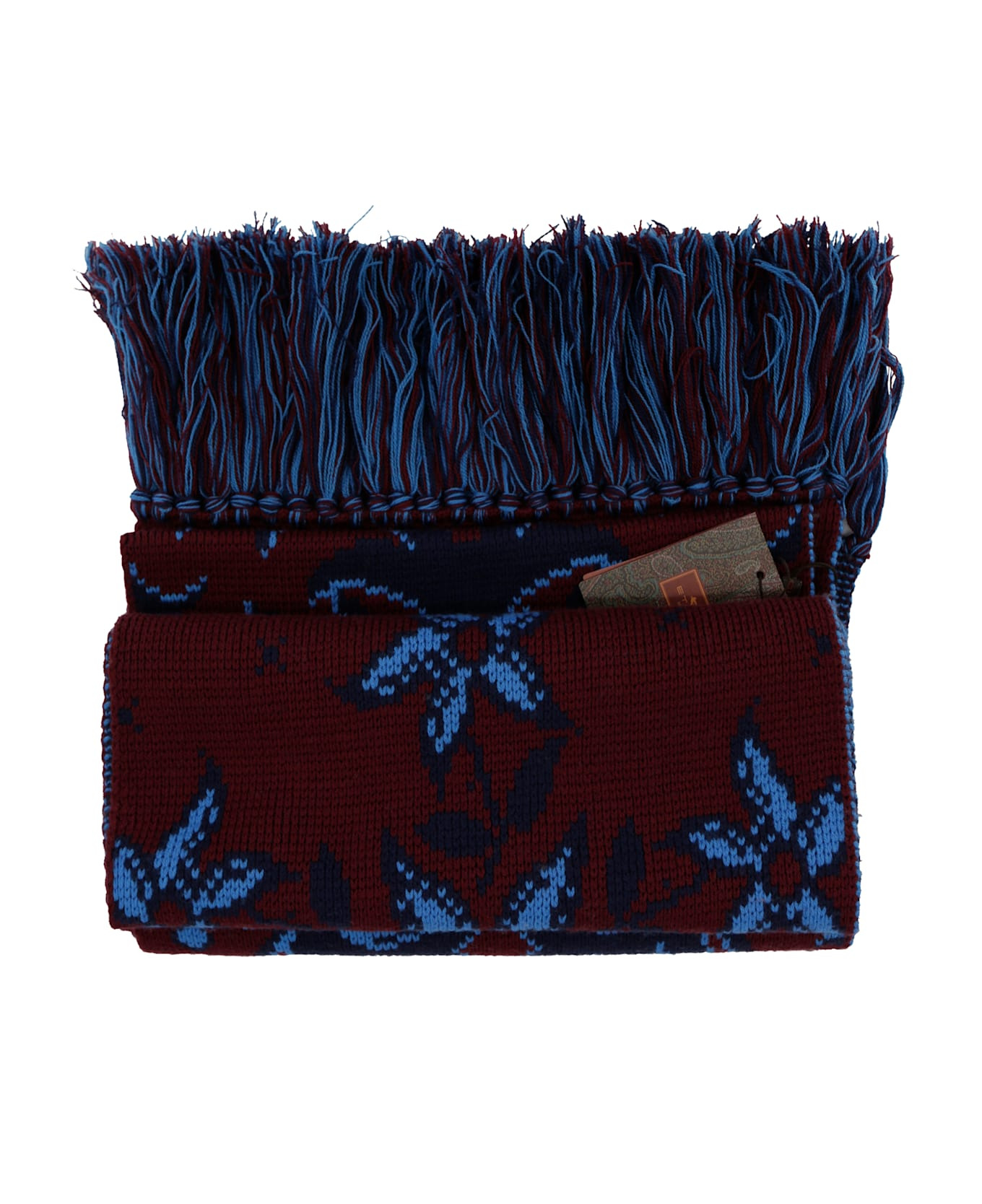 Jacquard scarf with a soft and warm texture in burgundy base with floral motifs in light blue and blue, fringes always in shades of light blue and burgundy that add movement and refinement. The garment has a medium width ideal for both elegant coats and casual jackets. It pairs well with neutral palettes or blue and burgundy tones for an elegant tone-on-tone effect Composition: 100% Wool Made in: Italy Color: Purple Model number: WAKJ0001AQ171S9825
