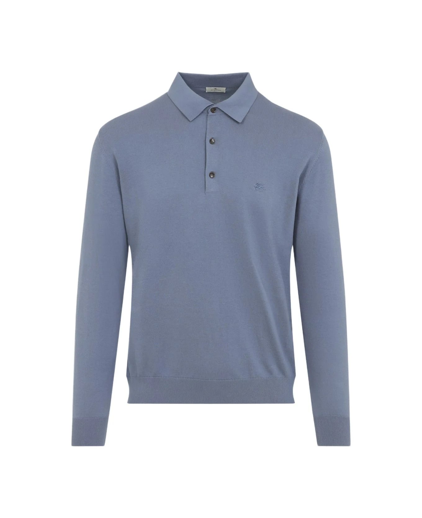 Etro Knitted Light Blue Cotton Polo. Long-sleeved polo crafted from light blue cotton, it features a pointed collar, a three-button fastening, the Pegaso logo embroidered on the chest, and a regular fit. Made in: China Color: Air Force Blue Model number: MRKF0028AQ408B0068